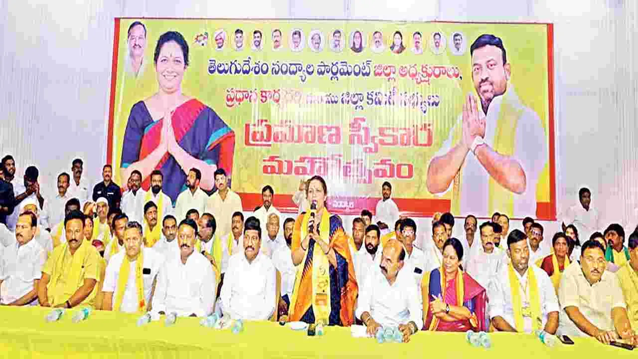 నంద్యాల, జనవరి 25 (ఆంధ్రజ్యోతి): తెలుగుదేశం పార్టీ నంద్యాల జిల్లా కమిటీ ప్రమాణ స్వీకారోత్సవం ఆదివారం వేడుకగా జరిగింది. పట్టణంలోని ఎస్ఆర్ పంక్షన్ హాల్లో టీడీపీ జిల్లా కార్యవర్గసభ్యులు ప్రమాణస్వీకారం చేశారు. ఈ కార్యక్రమానికి మంత్రులు బీసీ జనార్ధన్ రెడ్డి, ఎన్ఎండీ ఫరూక్తో పాటు ఎమ్మెల్యేలు బుడ్డా రాజశేఖర్రెడ్డి, గిత్తా జయసూర్య తదితర ముఖ్య నాయకులు హజరయ్యారు. ముందుగా నాయకులు ఎన్టీఆర్ విగ్రహానికి పూలమాలు వేసి నివాళులర్పించారు. అనంతరం టీడీపీ జిల్లా అధ్యక్షురాలిగా గౌరు చరిత, జిల్లా ప్రధాన కార్యదర్శిగా ఎన్ఎండీ ఫిరోజ్తో పాటు 40 మంది కార్యవర్గ సభ్యులు ప్రమాణస్వీకారం చేశారు. ఈ సందర్భంగా మంత్రి బీసీ మాట్లాడుతూ టీడీపీ నేతలు, కార్యకర్తలపై నూతన కార్యవర్గం అండగా నిలవాలన్నారు. ప్రజలు కూటమి పార్టీకి భారీ మెజార్టీ ఇవ్వడంతో బాధ్యత మరింత పెరిగిందన్నారు. వచ్చే స్థానిక సంస్థల ఎన్నికల్లో పార్టీ నేతలందరూ ఒక్కటై సత్తా చాటుదామన్నారు. కూటమి ప్రభుత్వం చేస్తున్న అభివృద్ధిని చూసి వైసీపీ ఓర్చుకలేకపోతోందన్నారు. వైసీపీ నేతలు స్థాయికి మించి సిగ్గు.. శరం లేకుండా విమర్శలు చేస్తున్నారని మండిపడ్డారు. గత ఐదేళ్లలో వైసీపీ చేసిన పాపాలు వారికి నేడు శాపాలుగా మారుతున్నాయని దుయ్యబట్టారు. ప్రతిపక్ష హోదా కూడా దక్కని వైసీపీ నేతలకు మాట్లాడే అర్హత కూడా లేదని గుర్తు చేశారు. మంత్రి ఎన్ఎండీ ఫరూక్ మాట్లాడుతూ.. 1982 నుంచి ఎంతో మంది సీనియర్లు జిల్లాలో టీడీపీ పార్టీ బలోపేతానికి కృషి చేశారన్నారు. మళ్లీ వైసీపీ అధికారంలోకి వస్తే.. మీ సంగతి చూస్తామని వైసీపీ నేతలు బెదిరింపులకు పాల్పడుతున్నారన్నారు. పోలీసులను ఉద్దేశించి సప్త సముద్రాల అవతల ఉన్నా.. వదిలిపెట్టేదిలేదని జగన్మోహన్రెడ్డి హెచ్చరించడం సిగ్గుచేటన్నారు.జిల్లా అధ్యక్షురాలు, ఎమ్మెల్యే గౌరు చరిత మాట్లాడుతూ.. ఇదే నంద్యాలలో సీఎం చంద్రబాబును అక్రమ అరెస్ట్ చేయడంతో రాష్ట్ర వ్యాప్తంగా వైసీపీ దౌర్జాన్యాలను గుర్తించి 2024 ఎన్నికల్లో ప్రజలు 175 లో 164 స్థానాల్లో కూటమి అభ్యర్థులను గెలిపించి కూటమికి బ్రహ్మరథం పట్టారని గుర్తు చేశారు. కార్యకర్తలు, నాయకుల సేవలను ఎప్పటికి గుర్తించుకుంటామన్నారు. జిల్లా ప్రధాన కార్యదర్శి ఎన్ఎండీ ఫిరోజ్ మాట్లాడుతూ.. 2024 ఎన్నికల మాదిరిగానే.. 2029 ఎన్నికల్లోనూ అన్ని స్థానాలను క్వీన్ స్లీప్ చేసే విధంగా కృషి చేస్తామన్నారు. వచ్చే స్థానిక సంస్థల ఎన్నికల్లోను సమిష్టిగా పనిచేసి పార్టీకి ప్రత్యేక గుర్తింపు తీసుకువస్తాన్నారు.