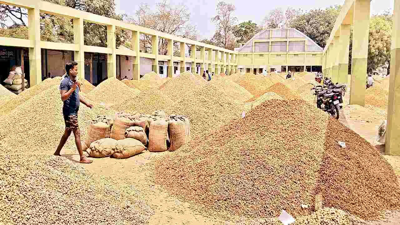 ఎమ్మిగనూరు, మార్చి 15(ఆంధ్రజ్యోతి): ఎమ్మిగనూరు వ్యవ సాయ మార్కెట్కు పంట ఉత్ప త్తులు భారీగా అమ్మకానికి వచ్చాయి. వేరుశనగతో పాటు ఆముదాలు, కందులు, మొక్కజొన్న, శనగతో కలిపి మొత్తం 12151 (3,693క్వింటాళ్లు) బస్తాలు రైతులు అమ్మకానికి తరలించారు. మార్కెట్ పంట ఉత్పత్తులతో కళకళలాడింది. వేరుశనగ ధర గత వారంతో పోలిస్తే స్వల్పంగా పెరిగింది. గత శుక్రవారం వేరుశనగ గరిష్ఠ ధర రూ.8,700లు పలుకగా ఆదివారం రూ. 9,290 పలికింది. మార్కెట్కు వేరుశనగ 11,914బస్తాలు(3574క్వింటాళ్లు)రాగా కనిష్ఠం రూ. 3461, మధ్యస్థం రూ.7120, గరిష్ఠం రూ.9,290 పలికాయి. ఆముదాలు 176 బస్తాలు (88క్వింటాళ్లు) రాగా కనిష్ఠ ధర రూ.2520, గరిష్ఠం రూ.5904లు, కందులు 11బస్తాలు (6క్వింటాళ్లు)రాగా కనిష్ఠ ధర రూ.6520లు, గరిష్ఠం రూ. 7029లు, మొక్కజోన్న 27 బస్తాలు(14క్విటాళ్లు) కనిష్ఠ ధర రూ.1050, గరిష్ఠం ధర రూ. 1050లు పలికాయి.
