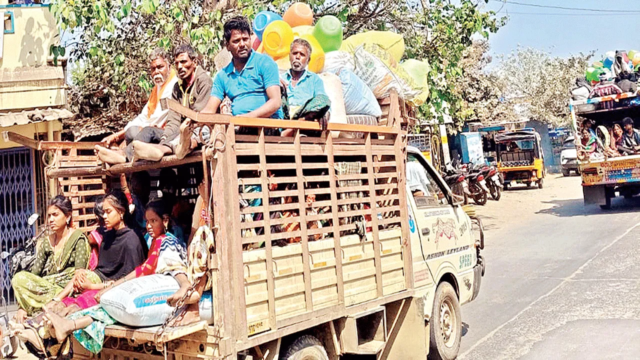 గోనెగండ్ల, జనవరి 22(ఆంధ్రజ్యోతి): గోనెగండ్ల మండలం నుంచి వలసలు రోజురోజకు పెరుగుతున్నాయి. గురువారం మండల కేంద్రమైన గోనెగండ్ల తో పాటు మండలంలోని పలు గ్రామాల నుంచి దాదాపు 10 బోలోరో వాహనలలో వ్యవసాయ కూలీలు, చిన్న, సన్నకారు రైతులు వలస బాట పట్టారు. సంక్రాంతి పండుగ ముగియడంతో వలసలు బాట పట్టారు. గోనెగండ్ల నుంచి గురువారం దాదాపు 30 కుటుంబాలు గుంటూరుకు వలస పోయారు. అక్కడ మిర్చి పనులలో పని కుదుర్చుకున్నారు. మిర్చి పంట తెంపితే రూ. 500 లు, పంటను రోడ్డుకు మోసేందుకు గాను ఒక్కరికి కూలీ రూ. 700 ప్రకారం రెండు పూటల బోజనం కూడా పొలం యజమానే ఏర్పాటు చేయాలని ఒప్పందం కుదుర్చుకొని బయలు దేరారు. గోనెగండ్ల నుంచి కూలీలు అందరు రాజంపేట, సంగారెడ్డి జిల్లా జోగిపేట మండలం ముసలపూర్ గ్రామంకు వెళ్లాతున్నారు. అక్కడ పత్తి పొలాలలో పత్తి, వేరుశనగ పంటలను తీసేందుకు కూలీ కుదుర్చు కున్నారు. దీంతో గ్రామాల్లోని వీదులు నిర్మాణుషంగా కనిపిస్తున్నాయి. ప్రతి రోజు గోనెగండ్ల మండలం నుంచి గుంటూరు, హైదరాబాదు, రాజంపేట తదితర ప్రాంతాలకు కడుపు చేత పట్టు కోని వలసలు వెలుతున్నారు. స్థానికంగా పొలం పనులు లేక పోవ డం కారణంగా వలసలు పోతున్నట్లు కూలీలు తెలుపుతున్నారు. గుంటూరు, తెలంగాణా ప్రాంతాల్లో పత్తి పొలాల్లో పనులు ఉన్నాయని అక్కడ ఉగాది పండుగ వరకు పనులు చేసుకొని స్వంత గ్రామానికి వస్తామని కూలీలు అంటున్నారు.