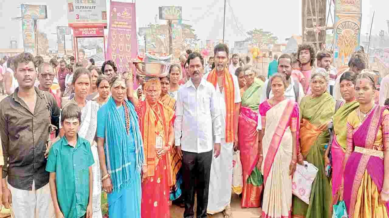 శ్రీశైలం, జనవరి 31 (ఆంధ్రజ్యోతి): తెలంగాణ ప్రఖ్యాతి గాంచిన సమ్మక్క సారలక్క గిరిజన జాతరకు శ్రీశైలం చెంచు భక్తులు తరలివెళ్లారు. ఆదివారం శ్రీశైలం ట్రస్ట్బోర్డు సభ్యురాలు గంగమ్మ, కొమరంభీం ఆదివాసీ చెంచు గిరిజన సంక్షేమ సంఘం అధ్యక్షుడు వై. ఆశిర్వాదం ఆధ్వర్యంలో మేక లబండ చెంచు భక్తులు శ్రీశైల భ్రమరాంబ మల్లికార్జున స్వామిఅమ్మవార్లకు ప్రత్యేక పూజలు చేసుకుని పట్టువస్త్రాలు తీసుకుని వెళ్లి మేడారం వన దేవతలైన సమ్మక్క సారలమ్మకు బెల్లం కొబ్బరికాయలు, పసుపు, కుంకుమ, గాజులతో అమ్మవారి గద్దెలపై మెక్కులుగా సమర్పించినట్లు చెప్పారు. ఎమ్మెల్యే బుడ్డా రాజశేఖర్రెడ్డి, ఆలయ ధర్మకర్తల మండలి అధ్యక్షులు పోతుగుంట రమేష్నాయుడు, ఈవో శ్రీనివాస రావుల సహకారంతో సుమారు 50 మందితో మేడారం జాతరకు వెళ్లినట్లు ఆశీర్వాదం తెలిపారు.