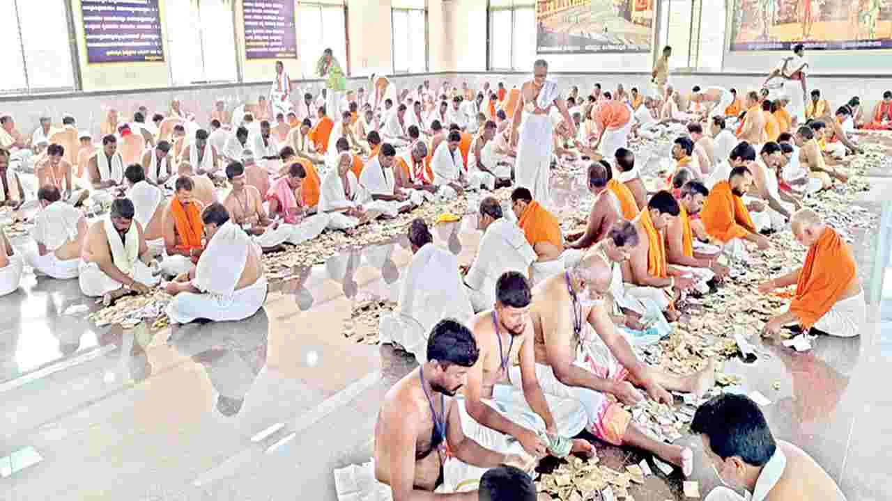 మంత్రాలయం, ఫిబ్రవరి 10(ఆంధ్రజ్యోతి): మంత్రాలయం రాఘవేంద్ర స్వామి మఠం హుండీని మంగళవారం లెక్కించారు. ఆదాయం రూ.3,08,37,571 నగదు వచ్చినట్లు మఠం ఏఏవో మాధవశెట్టి, మేనేజర్లు ఎస్కే శ్రీనివాసరావు, వెంకటేష్ జోషి, సురేష్ కోణాపూర్ తెలిపారు. జనవరి, ఫిబ్రవరి నెలలోని 21 రోజుల హుండీని మఠం గురురాజాంగణ భవనంలో దేవదాయ శాఖ ఇన్స్పెక్టర్ వెంకటేశ్వర్లు ఆధ్వర్యంలో కట్టుదిట్టమైన భద్రత, సీసీ కెమెరాల నిఘా మధ్య హుండీ లెక్కించినట్లు తెలిపారు. రూ.3,08,37,571 నగదుతో పాటు 1018 గ్రాముల వెండి, 13 గ్రాములు బంగారు, వివిధ దేశాల కరెన్సీ వచ్చిందన్నారు. నగదును శ్రీమఠం బ్యాంకు ఖాతాలో జమచేసినట్లు తెలిపారు. అనంత పురాణిక్, దత్తుస్వామి, జేపీస్వామి, కృష్ణమూర్తి, దేశాయ్ నరసింహమూర్తి, గిరిధర్, సుజ్ఞానేంద్ర, శ్రీపాదాచార్ పాల్గొన్నారు.