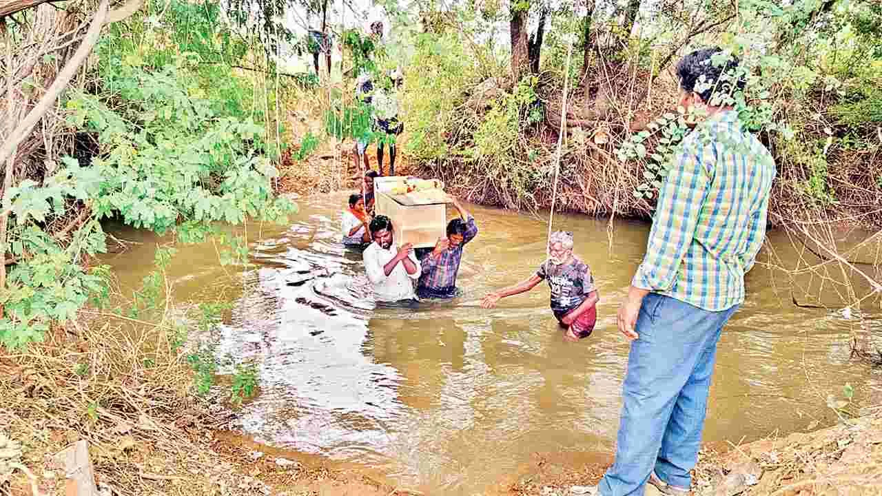ఆగ్రామంలో ఆఖరి మజిలికి కూడా అవస్థల తప్పడం లేదు. భూబకాసురుల దాహానికి ప్రజలకు కష్టాలు ఎదురవుతున్నాయి. శ్మశాన స్థలాన్ని సైతం ఆక్రమించుకోవడంతో అంత్యక్రియలు నిర్వహించేందుకు ఇక్కట్లు పడాల్సిన పరిస్థితి దాపురిచింది. నంద్యాల జిల్లా చాగలమర్రి మండలంలోని తోడెండ్లపల్లె గ్రామంలో దళితులకు కేటాయించిన శ్మశాన స్థలం ఆక్రమణకు గురైంది. దళిత కాలనీలో ఎవరైన మృతి చెందితే అంత్యక్రియలు, మృతదేహాన్ని పూడ్చేందుకు అవస్థలే. ఈ క్రమంలో శనివారం ఎస్సీ కాలనీకి చెందిన శ్రీరాముడు కుమార్తె మరియమ్మ(25) అనారోగ్యానికి గురై మృతి చెందింది. శవాన్ని పూడ్చేందుకు స్థలం లేక అవస్థలు పడ్డారు. శవ పేటికతో గ్రామ సమీపంలోని వంక వద్దకు తీసుకెళ్లి నీటిలో నుంచే మృతదేహాన్ని తీసుకెళ్లి అంత్యక్రియలు చేశారు. శ్మశాన స్థలం వంక వెంబడి అంత్యక్రియలు చేయాల్సి వస్తోంది. గతంలో 98 సర్వే నంబర్లో 45 సెంట్ల స్థలాన్ని శ్మశానం కోసం అధికారులు కేటాయించారు. కొలతలు వేసి వదిలేశారు. 6 ఏళ్లు గడుస్తున్నా స్థలాన్ని చూపలేదు. శ్మశాన స్థలాన్ని గ్రామానికి చెందిన ఓ వ్యక్తి ఆక్రమించుకోవడంతో సమస్య తలెత్తిందని దళితులు ఆరోపిస్తున్నారు. ఇప్పటికైనా అధికారులు, ప్రజాప్రతినిధులు స్పందించి శ్మశాన స్థలాలను కాపాడాలని పలువురు వేడుకుంటున్నారు.