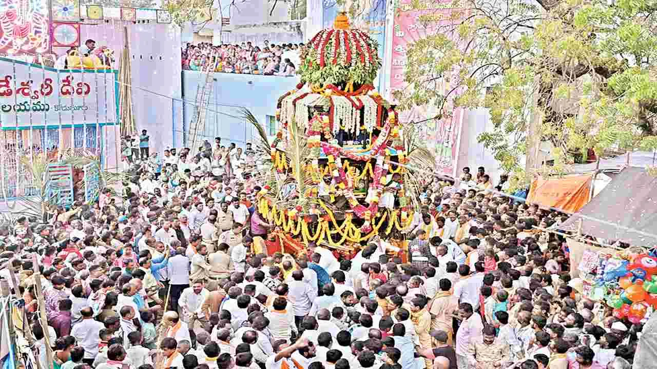 కోడుమూరు, ఫిబ్రవరి 3(ఆంధ్రజ్యోతి): పట్టణంలో వెలసిన చౌడేశ్వరీదేవి అమ్మవారి తిరుగు రథోత్సవం మంగళవారం సాయంత్రం ఘనంగా జరిగింది. ఆటగార దేవాంగ దైవచార సంఘం ఆధ్వర్యంలో నిర్వహించే ఈ వేడుకలను తిలకించేందుకు జిల్లాలోని వివిధ ప్రాంతాల నుంచి భక్తులు పెద్ద ఎత్తున తేరుబజార్కు చేరుకున్నారు. దీంతో పురవీధులు కిక్కిరిసిపోయాయి. ముందుగా దేవాలయంలో చౌడేశ్వరీదేవి అమ్మవారికి ప్రత్యేక పూజలు నిర్వహించారు. రథానికి పూజల అనంతరం తిరుగు రథోత్సవం ప్రారంభమైంది. అశేష జనవాహిని మధ్య అమ్మవారి వేడుక వైభవంగా సాగింది. రథం ముందుకు సాగుతుండగా భక్తులు రథంపై పూల వర్షం కురిపించారు. అమ్మవారి దర్శనం కోసం భక్తులు బారులుదీరారు. ఎలాంటి అవాంఛనీయ సంఘనటలు జరగకుండా సీఐ తబ్రేజ్ ఆధ్వర్యంలో ఎస్ఐలు డీవై స్వామి బందోబస్తు నిర్వహించారు. ఈ కార్యక్రమంలో ఆటగారదేవాంగ దైవచార సంఘం సభ్యులు నాగప్ప, కావ నాగరాజు, మల్లి, శేఖర్, బ్రహ్మయ్య చెప్పారు. బుధవారం పారువేట, గురువారం వసంతోత్సవంతో అమ్మవారి జాతర ఉత్సవాలు ముగుస్తాయని నిర్వాహకులు తెలిపారు.