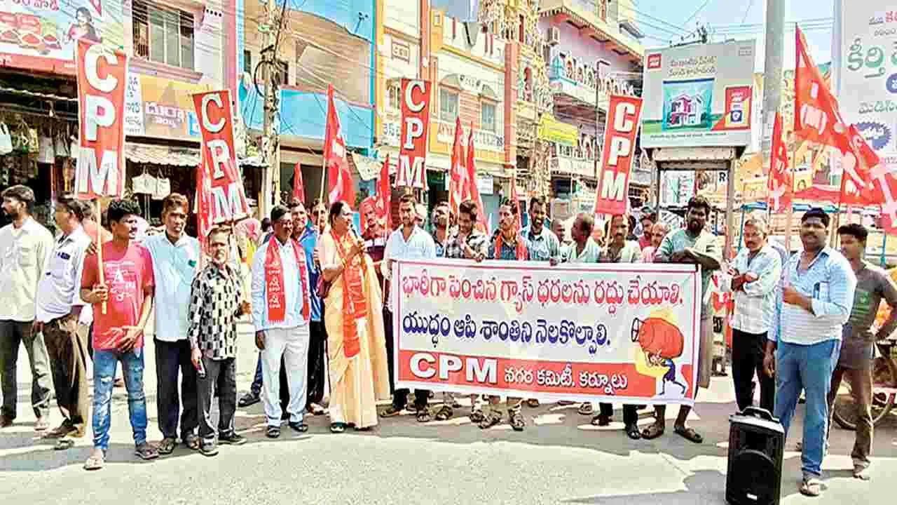 కర్నూలు న్యూసిటీ, మార్చి 8(ఆంధ్రజ్యోతి): కేంద్ర ప్రభుత్వం పెంచిన వంట గ్యాస్ ధరలను తక్షణమే ఉపసంహరించుకోవాలని సీపీఎం రాష్ట్ర కమిటీ సభ్యురాలు పి.నిర్మల డిమాండ్ చేశారు. ఆదివారం పాతబస్తీ పొట్టిశ్రీరాములు కూడలిలో గ్యాస్ ధరలను ఉపసంహరించుకోవాలని కోరుతూ నగరకార్యదర్శి ఎం.రాజశేఖర్ అధ్యక్షతన ధర్నా నిర్వహించారు. ఆమె మాట్లాడుతూ అమెరికా, ఇరాన్ యుద్ధం సాకు చూపి వంట గ్యాస్ ధరలు పెంచడం హేయమైన చర్య అన్నారు. గల్ప్ దేశాలపై చమురు కోసం తహతహలాడుతూ అన్ని దేశాలపై యుద్ధం చేస్తున్న డోనాల్డ్ ట్రంప్ విధానాలను వ్యతిరేకించాలని పిలుపునిచ్చారు. జిల్లా కార్యదర్శి డి.గౌ్సదేశాయ్, నాయకులు ఎస్.ఏ.సుభాన్, ఎస్ఎండీ.షరీఫ్, అబ్దుల్దేశాయ్, రామక్రిష్ణ, రాంబాబు పాల్గొన్నారు