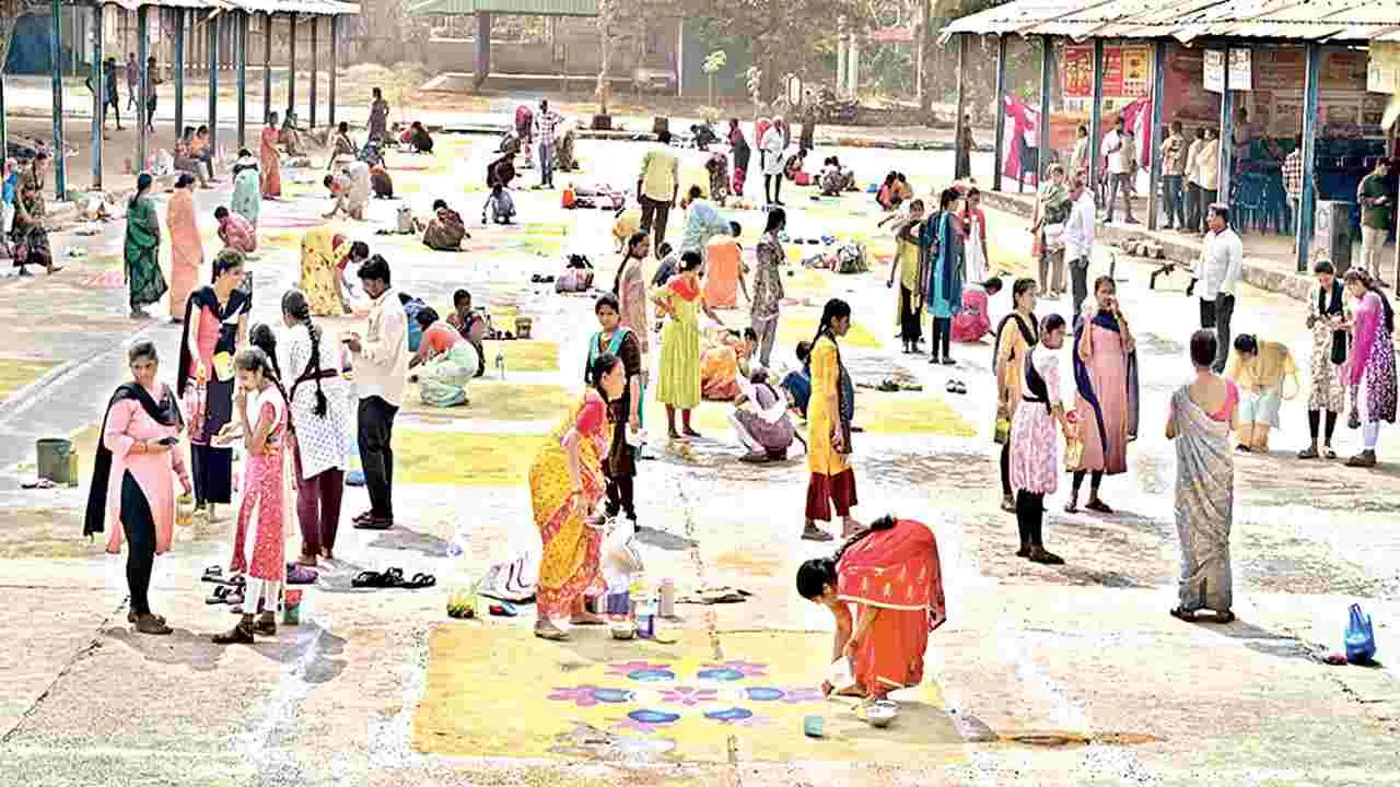 రంగురంగుల ముగ్గుతో ఇలపై హరివిల్లు వాలింది. చక్కనైన ముగ్గుల అలంకరణతో భూమాత పులకించింది.