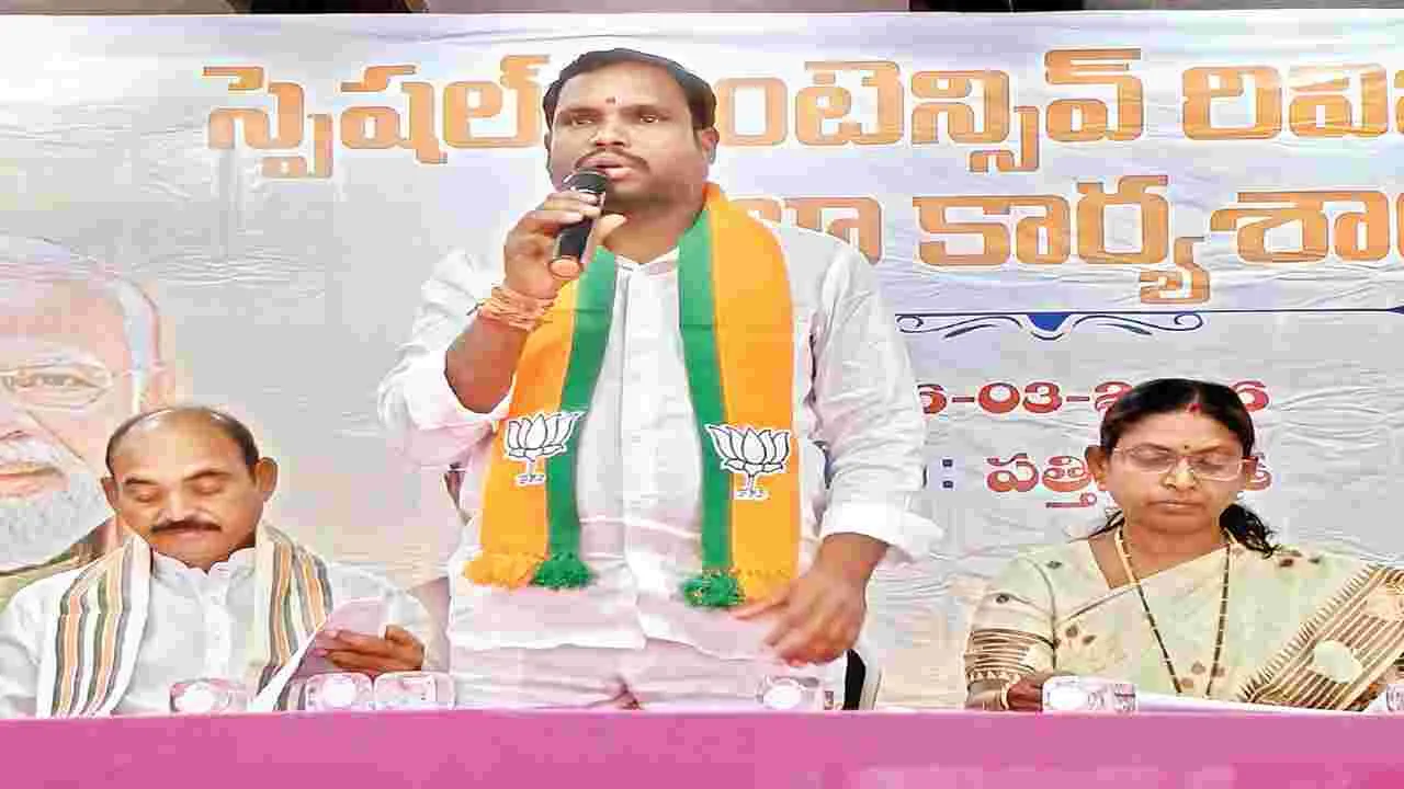 పత్తికొండ టౌన్, మార్చి 26 (ఆంధ్రజ్యోతి): జిల్లాలో పార్టీ బలోపేతానికి ప్రతి ఒక్కరూ అంకితభావంతో పనిచేయాలని బీజేపీ జిల్లా అధ్యక్షుడు అక్కమ్మతోట రామకృష్ణ పార్టీ శ్రేణులకు పిలుపునిచ్చారు. గురువారం స్థానిక గోపాల్ ప్లాజాలో బీజేపీ ఆధ్వర్యంలో స్పెష ల్ ఇంటెన్సివ్ రివిజన్ (ఎస్ఐఆర్) జిల్లా కార్యశాల సమావేశం గోవర్ధన్నాయుడు అధ్యక్ష తన జరిగింది. ముఖ్యఅతిథులుగా జిల్లా అధ్యక్షుడు రామకృష్ణ, బీజేవైఎం రాష్ట్ర అధ్యక్షుడు సునీల్రెడ్డి, రజక కార్పొరేషన్ చైర్మన్ సావిత్రమ్మ, కోడు మూరు మాజీ ఎమ్మెల్యే మురళి మోహన్, కర్నూలు జిల్లా ఇన్ చార్జి అంకల్రెడ్డి పాల్గొని మాట్లాడారు. కేంద్ర ప్రభుత్వం అమలు చేస్తున సంక్షేమ పథకాలను గ్రామీణస్థాయికి తీసుకెళ్లాల్సిన బాధ్యత కార్యకర్తలదే అన్నారు. రాబోయే స్థానిక సంస్థల ఎన్నిక లను దృష్టిలో పెట్టుకొని బూత్స్థాయి లెవెల్లో పార్టీని మరింత బలంగా నిర్మాణం చేపట్టాల్సిన అవసరం ఉందన్నారు. ఈ సంద ర్భంగా పలు గ్రామాలకు చెందిన వారు బీజేపీలో చేరగా వారికి పార్టీ కండువాలు కప్పి నాయ కులు ఆహ్వానించారు. బిల్డింగ్ కార్పొరేషన్ చైర్మన్ విట్టా రమేష్, వాల్మీకి డైరెక్టర్ మురళీ నాయుడు, రాష్ట్ర కార్యదర్శి సురవరం గీతామాధురి, స్థానిక నాయ కులు కరణం నరేష్, మల్లికార్జున, సి.సి.రంగన్న, బ్రహ్మయ్య, రామాంజినేయులు పాల్గొన్నారు.