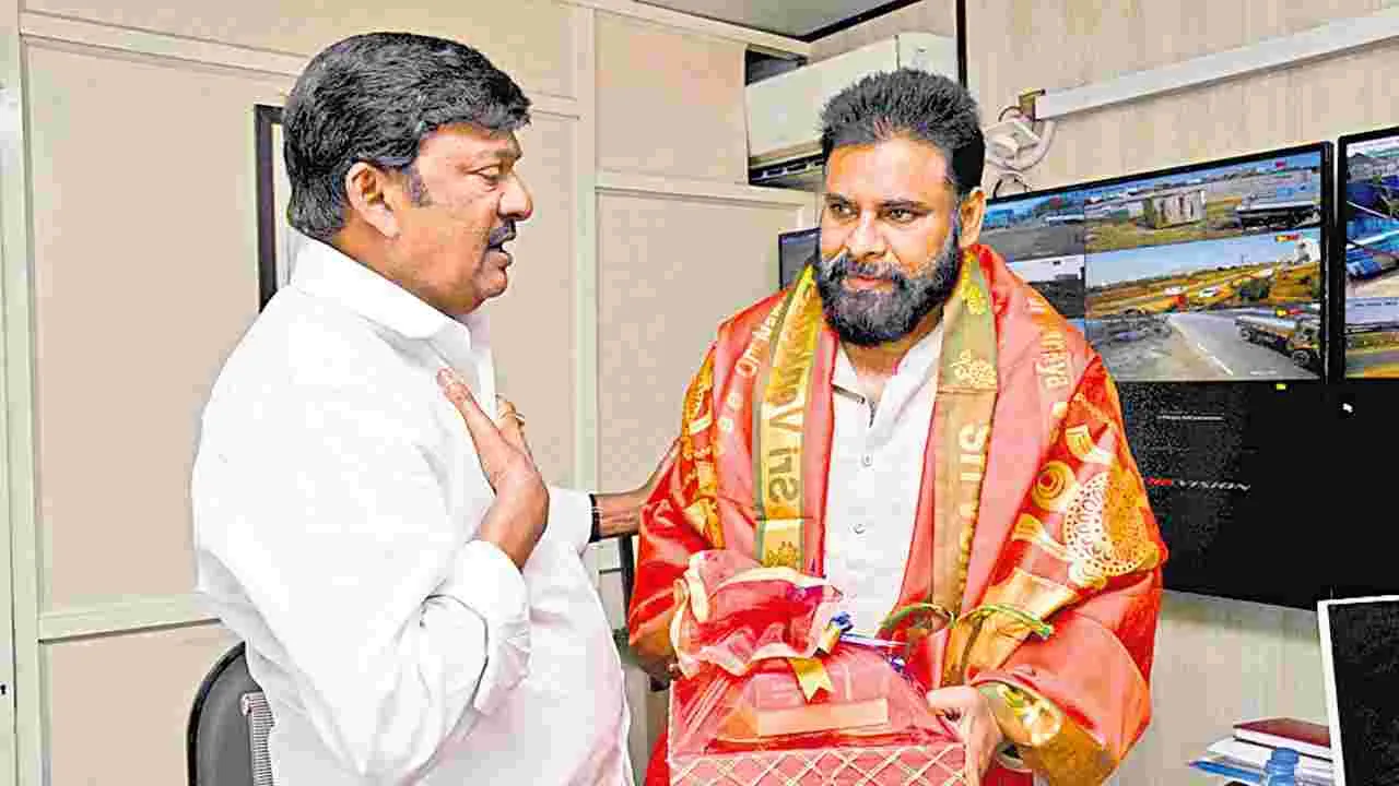 అమరావతి, ఫిబ్రవరి 4(ఆంధ్రజ్యోతి): ప్రముఖ శైవక్షేత్రం శ్రీకాళహస్తి లో శివరాత్రి సందర్భంగా నిర్వహించనున్న బ్రహ్మోత్సవాలకు ఉపముఖ్యమంత్రి పవన్ కల్యాణ్ను ఆహ్వానించారు. ఆలయ ట్రస్టు బోర్డు చైర్మన్ కొట్టే సాయిప్రసాద్ నేతృత్వంలో వచ్చిన కమిటీ సభ్యులు బుధవారం మంగళగిరిలో పవన్ కల్యాణ్ను కలిశారు. బ్రహ్మోత్సవాల ఆహ్వాన పత్రికను అందించారు.