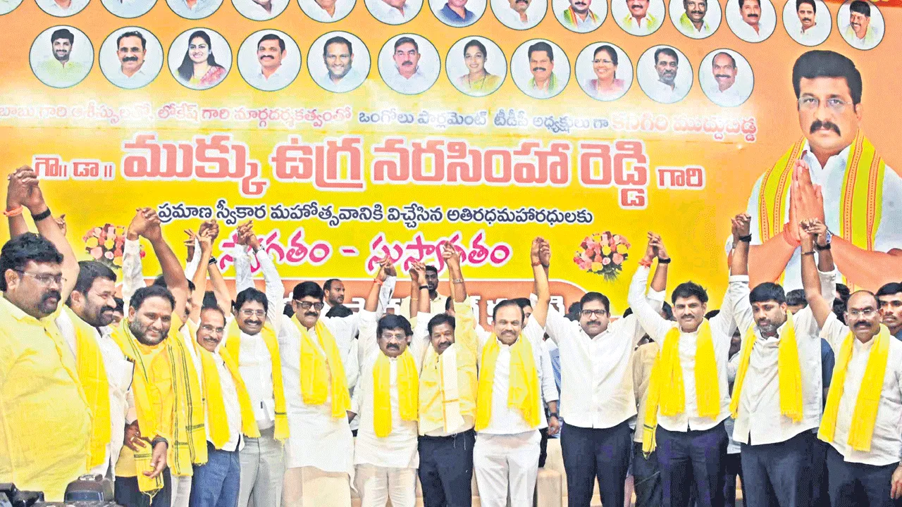 ఇటు నేతలు, అటు పార్టీశ్రేణుల్లో డాక్టర్ ముక్కు ఉగ్రనరసింహారెడ్డిపై ఉన్న నమ్మకం స్పష్టమైంది. అందుకు శనివారం సాయంత్రం ఆయన పదవీ బాధ్యతల స్వీకరణ కార్యక్రమం జరిగిన తీరు అద్దం పట్టింది. పార్టీ కార్యకర్తలు, శ్రేణులతో ప్రాంగణం కిట కిటలాడగా ఉమ్మడి ప్రకాశం జిల్లా నుంచి తరలివ చ్చిన టీడీపీ నాయకులతో వేదిక కూడా కళకళలాడింది.