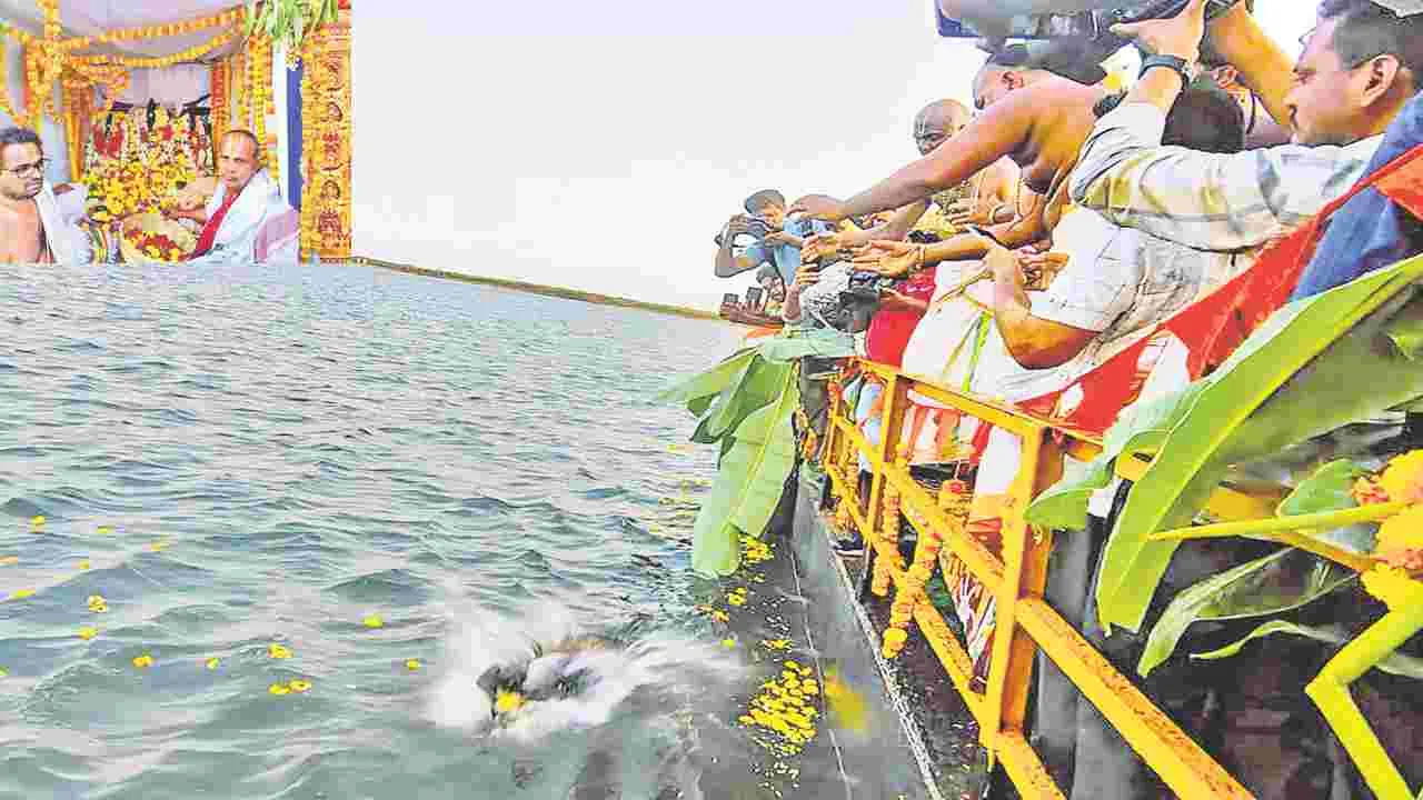 కె.గంగవరం, ఏప్రిల్13(ఆంధ్రజ్యోతి): వందల ఏళ్ల చరిత్ర కలిగిన విజయనగరం జిల్లా రామతీర్థం క్షేత్రంలోని సీతారామలక్ష్మణుల విగ్రహాలను కోటిపల్లి పుణ్యక్షేత్రంలో సోమవారం సాయంత్రం శాస్త్రోక్తంగా జలాధివాసం చేశారు. శ్రీరామ భక్తులు, కూటమి నాయకులు తరలిరాగా వేద పండితులు హోమం చేసి పూర్ణాహుతి ఇచ్చి స్వామి వార్ల విగ్రహాలను గోదావరి మధ్యలోకి తీసుకెళ్లి క్షీరాన్నాభిషేకం, పుష్పాభిషేకం చేసి జలాధివాసం చేశారు. కాగా.. రామతీర్థం క్షేత్రంలోని భిన్నమైన విగ్రహాలను శాస్త్ర ప్రకారం గోదావరి నదిలో జలాఽధివాసం చేశామని దేవదాయశాఖ కమిషనర్ కె.రామచంద్రమోహన్ పేర్కొన్నారు. కోటిపల్లి పుష్కరాల రేవులో ఆయన మాట్లాడుతూ.. విజయనగరం జిల్లా రామతీర్థం పుణ్యక్షేత్రంలోని రామాలయంలో 2020 డిసెంబరులో రాములవారి విగ్రహం తలభాగాన్ని వేరుచేసి దుండగులు చెరువులో పడేశారు. అనంతరం తిరుమల తిరుపతి దేవస్థానం నుంచి తీసుకువచ్చిన విగ్రహాలను ప్రతిష్ఠించారు. అయితే భిన్నమైన విగ్రహాలను అలా ఉంచకూడదని, వేద పండితుల సూచనలతో ముఖ్యమంత్రి చంద్రబాబు నాయుడు, దేవదాయ శాఖ మంత్రి ఆనం రామనారాయణరెడ్డి ఆదేశాలతోపాటు కోర్టు సూచనల మేరకు జలాధివాసం కార్యక్రమం ఏర్పాటు చేశామని కమిషనర్ చెప్పారు. సోమవారం ఉదయం 5 గంటలకు రామతీర్థంలో వైదిక కార్యక్రమాలు నిర్వహించి ప్రారంభించిన శోభాయాత్ర సింహాచలం, అన్నవరం, పిఠాపురం, ద్రాక్షారామ మీదుగా సాయంత్రం కోటిపల్లి చేరుకుంది.