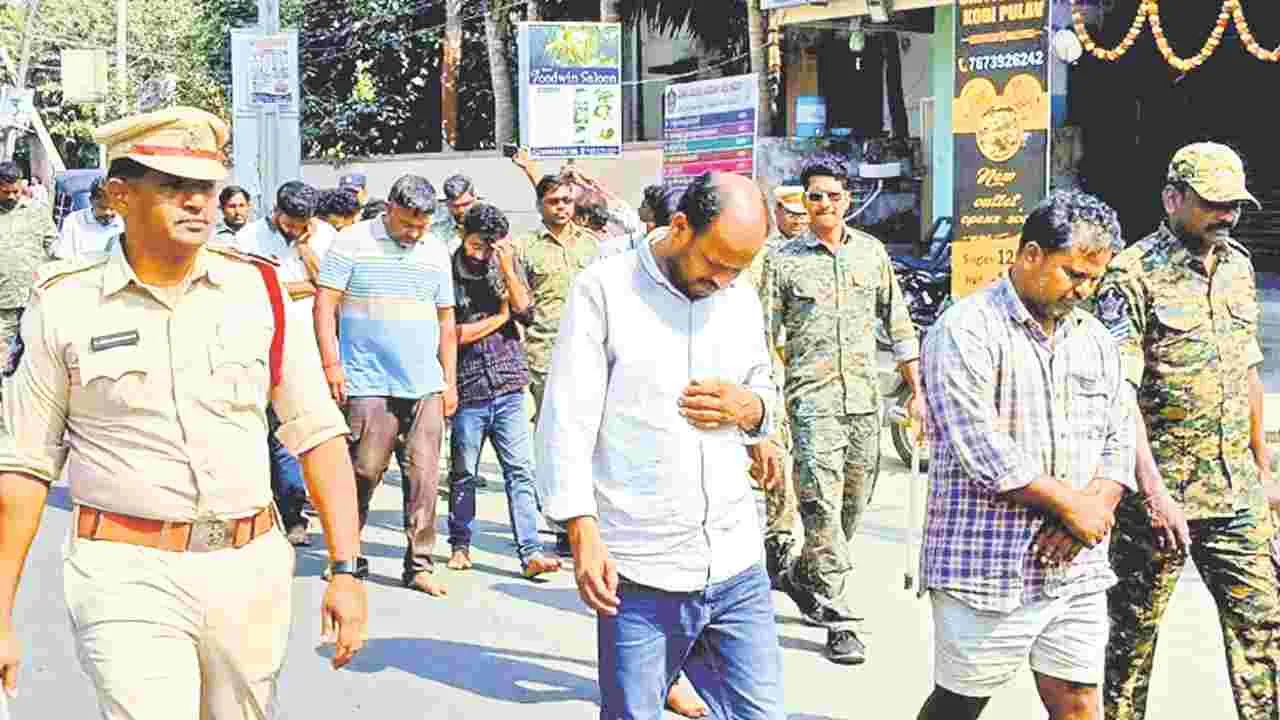 తుని రూరల్, జనవరి 21(ఆంధ్రజ్యోతి): టీడీపీ కార్యకర్తను దారుణంగా హతమార్చిన కేసులో నిందితులకు తుని రూరల్ పోలీసులు స్పెషల్ ట్రీట్మెంట్ ఇచ్చారు. మొత్తం 12మంది నిందితులను అరెస్ట్ చేసి, వారిని రోడ్డుపై నడిపించుకుంటూ తీసుకెళ్లి కోర్టులో హాజరుపరిచారు. పెద్దాపురం డీఎస్పీ శ్రీహరిరాజు తెలిపిన వివరాల ప్రకారం.. కాకినాడ జిల్లా కోటనందూరు మండలం అల్లిపూడి గ్రామంలో కొన్నేళ్లుగా టీడీపీ, వైసీపీ వర్గాల మధ్య వైరం కొనసాగుతోంది. ఈ నెల 16న గ్రామంలో ఓ టీడీపీ నాయకుడి పుట్టినరోజు వేడుకలకు పలువురు టీడీపీ కార్యకర్తలు హాజరయ్యారు. వీరంతా రాత్రి 8 గంటల సమయంలో సమీపంలోని రామాలయం వద్ద జరుగుతున్న సాంస్కృతిక కార్యక్రమం చూసేందుకు వెళ్తున్నారు. అప్పటికే కోటనందూరు వైసీపీ మండల అధ్యక్షుడు చింతకాయల చినబాబు ఇంటివద్ద కొంతమంది వైసీపీ శ్రేణులు కత్తులు, ఇనుప రాడ్లు, కర్రలతో కాపుకాశారు. అటుగా వచ్చిన టీడీపీ కార్యకర్తలపై పథకం ప్రకారం దాడికి పాల్పడ్డారు. ఈ దాడిలో టీడీపీ కార్యకర్త లాలం బంగారయ్య మృతి చెందాడని, ఈ కేసులో 12 మందిని అరెస్ట్ చేసి కోర్టుకు తరలించామని డీఎస్పీ తెలిపారు. సరిపడా వాహనం అందుబాటులో లేకపోవడంతో నిందితులను కాలినడకన కోర్టుకు తీసుకెళ్లాల్సి వచ్చిందని చెప్పారు.