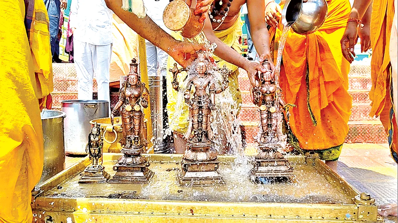 అరసవల్లి, ఏప్రిల్ 2(ఆంధ్రజ్యోతి): అరసవల్లి సూర్యనారాయణ స్వామి వారి వార్షిక కల్యాణోత్సవాల్లో భాగంగా చైత్రశుద్ధ పౌర్ణమి పురస్కరించుకొని బుధవారం ఆలయ అనివెట్టి మండపంలో ప్రధానార్చకులు ఇప్పిలి శంక రశర్మ ఆధ్వర్యంలో సుమంగళి అర్చన, నీలమణిధారణ నిర్వహించారు. అనంతరం ఆదిత్య ఆలయ ఇంద్రపుష్కరిణి వద్ద నాకబలి ప్రయుక్త చక్రతీర్థ స్నానం నిర్వహించారు. ఉత్సవమూర్తులను ఆలయ ప్రవేశం గావించారు. కార్యక్రమంలో ఆలయ ఈవో ప్రసాద్, అర్చకులు నేతేటి హరిబాబు, ఇప్పిలి ఫణీంద్రశర్మ, రంజిత్శర్మ, దర్భముళ్ల శ్రీనివాసశర్మ పాల్గొన్నారు.