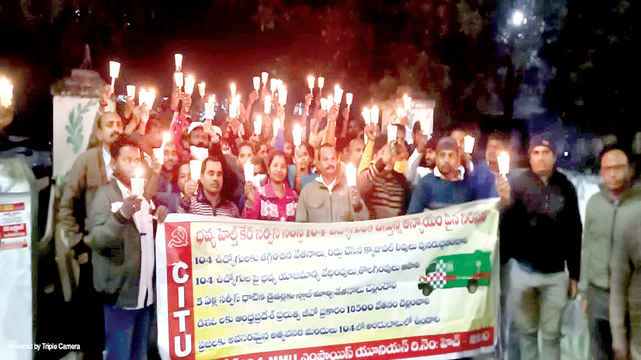 అరసవల్లి, జనవరి 6(ఆంధ్రజ్యోతి): 104 ఉద్యోగులపై భవ్య యాజమాన్యం వేధింపులు ఆపాలని, షోకాజ్ నోటీసులు, సస్పెన్షన్ చర్యలను నిలుపుదల చేయా లని వివిధ ప్రజా సంఘాల ప్రతినిధులు డిమాండ్ చేశారు. మంగళవారం శ్రీకాకు ళంలోని వైద్యారోగ్యశాఖ కార్యాలయం నుంచి ఏడురోడ్ల కూడలి వరకు తమ సమస్యలను పరిష్కరించాలని 104 ఉద్యోగులు కొవ్వొత్తుల ర్యాలీ నిర్వహించారు. ఈసందర్భంగా వివిధ ప్రజాసంఘాల ప్రతినిధులు మాట్లాడుతూ భవ్య యాజమా న్యం 104 ఉద్యోగులకు అన్యాయంచేస్తోందని విమర్శించారు.కార్యక్రమంలో ఎం.ఆది నారాయణ, జి.గిరిధర్, కె.గణపతి, సీఐటీయూ నాయకులు బి.మురళి, ప్రకాశరావు, 104 యూనియన్ జిల్లా అధ్యక్ష, కార్యదర్శులు నారాయణరావు, కిరణ్ పాల్గొన్నారు.