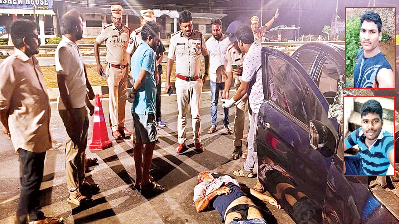 విశాఖపట్నం జిల్లా ఎంవీపీ కాలనీ శారదనగర్కు చెందిన సివిల్ కాంట్రాక్టర్ కరుణాకరం శ్రీనివాస్(59), పార్వతీపురం మన్యం జిల్లా సీతానగరం మండలం జోగిపేట మాజీ సర్పంచ్ కళ్యంపూడి సింహా చలం(48)తో మరోవ్యక్తి కారులో సోమవారం ఉదయం శ్రీకాకుళం వెళ్లారు. మరుసటి రోజు అక్కడి నుంచి విశాఖకు బయలుదేరారు. తిరిగి సోమవారం అర్ధరాత్రి 12గంటల సమయంలో కారుపై అతివేగంగా వస్తూ అదే సమయంలో పేరాపురం వద్ద జాతీయ రహదారిపై పెట్రోల్ బంక్ సమీపంలో టీ తాగి రోడ్డు పక్కన మాట్లాడుతున్న శ్రీకాకుళం జిల్లా కోటబొ మ్మాళి మండలం చినసాన పంచాయతీ గంగుపేట గ్రామానికి చెందిన సదునుపల్లి రమేష్ (25), సదునుపల్లి రాము (28) అనే యువకులను ఢీకొన్నారు. దీంతో వారిద్దరూ అక్క డికక్కడే వారు మృతి చెందారు. మృతదేహాలు రోడ్డుపై చెల్లచెదురుగా పడిపోయాయి.