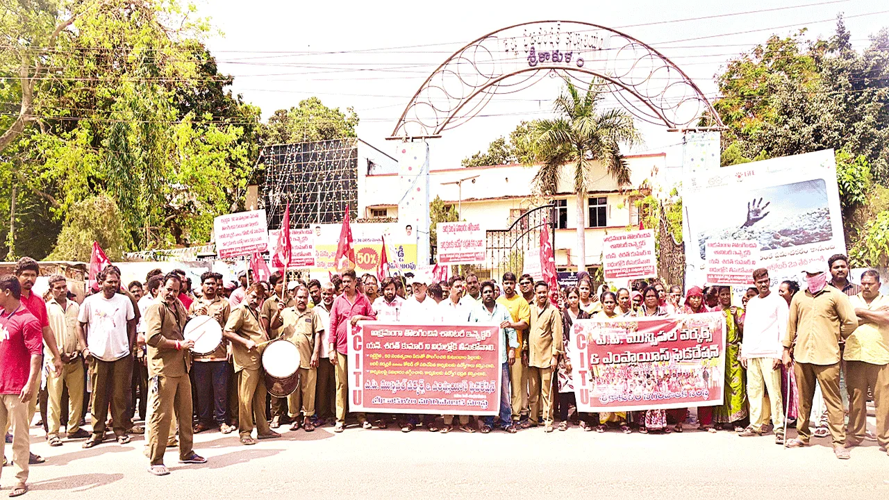 అరసవల్లి, మార్చి 23(ఆంధ్రజ్యోతి): నగర పాలక సంస్థలో పనిచేస్తున్న శానిటరీ ఇన్స్పెక్టర్ ఎన్.శరత్ కుమార్ను అకారణంగా తొలగిం చారని, తక్షణం విధుల్లోకి తీసుకోవాలని సీఐటీ యూ జిల్లా ప్రధాన కార్యదర్శి పి.తేజేశ్వరరావు, ఏపీ మున్సిపల్ వర్కర్స్, ఎంప్లాయీస్ ఫెడరేషన్ జిల్లా ప్రధాన కార్యదర్శి ఎన్.బలరాం డిమాండ్ చేశారు. ఈ మేరకు సోమవారం స్థానిక మునిసి పల్ కార్యాలయం నుంచి జడ్పీ వరకు భారీ ర్యాలీ నిర్వహించారు. అనంతరం ధర్నా నిర్వహించారు. ఈ సందర్భంగా వారు మాట్లాడుతూ.. 16 సంవ త్సరాలుగా క్రమశిక్షణతో విధులు నిర్వహిస్తున్న ఉద్యోగిని అకారణంగా విధుల నుండి తొలగిం చారని, ఎమ్మెల్యే, మంత్రులు తక్షణమే పరిష్కా రం చూపాలన్నారు. కార్మికులపై పనిభారం తగ్గిం చాలని కోరారు. శరత్కుమార్ వెంటనే విధుల్లోకి లేకుంటే పోరాటాలను ఉధృతం చేస్తామని హెచ్చరించారు. అనంతరం గ్రీవెన్స్లో అసిస్టెంట్ కలెక్టర్ పృథ్వీరాజ్ కుమార్కు వినతిపత్రం అంద జేశారు. కార్యక్రమంలో సీఐటీయూ నగర కన్వీ నర్ ఆర్.ప్రకాశరావు, ఎ.గణేష్, సంతోష్, రాంబా బు, చిట్టిబాబు, యుగంధర్ పాల్గొన్నారు.