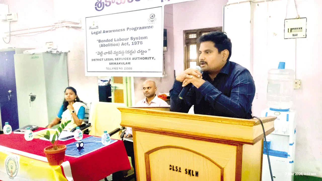 శ్రీకాకుళం లీగల్, ఫిబ్రవరి 26 (ఆంధ్ర జ్యోతి): జిల్లాలో వెట్టి చాకిరీ నిర్మూలించేందుకు అందరం కలిసి పని చేద్దామని జిల్లా న్యాయ సేవాధికార సంస్థ కార్య దర్శి కె.హరిబాబు అన్నారు. శనివారం అధికారులు, స్వచ్ఛంద సంస్థల ప్రతినిధులతో స్థానిక న్యాయసేవా సదన్ కార్యాలయంలో అవగాహన సద స్సు నిర్వహించారు. ఈ సంద ర్భంగా ఆయన మాట్లాడుతూ.. దేశంలో వెట్టి చాకిరీ నిర్మూలన చట్టం 1976లోనే చేసినప్పటికీ ఇప్పటికీ అనేక మంది కార్మికులు వెట్టిచాకి రీకి గురవుతు న్నారన్నారు. వెట్టిచాకిరీ చేయించుకునే యజమానులకు మూడేళ్ల జైలు శిక్షతో పాటు రూ.2 వేల జరిమానా ఉంటుందన్నారు. దీనిపై క్షేత్ర స్థాయిలో ప్రజల్లో చైతన్యం చేసేందుకు అధికారులు, స్వచ్ఛంద సంస్థల ప్రతినిధులు భాగస్వా ములు కావాలన్నారు. కార్యక్ర మంలో కార్మికశాఖ డిప్యూటీ కమిషనర్ అజయ్, తహసీల్దార్ గణపతి, బి.గోపాల రావు, ఎస్.కిరణ్ కుమార్, నేచర్ సంస్థ ప్రతినిఽధులు జీకే దుర్గ, కిరణ్ తదితరులు పాల్గొన్నారు.