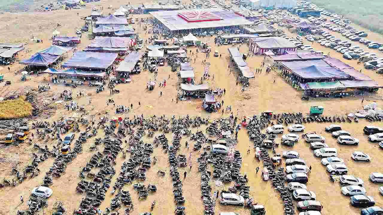 కృష్ణాజిల్లా కేసరపల్లి బరులకు హాజరైన జనం, పార్కింగ్లో కారులు, మోటార్సైకిళ్లు