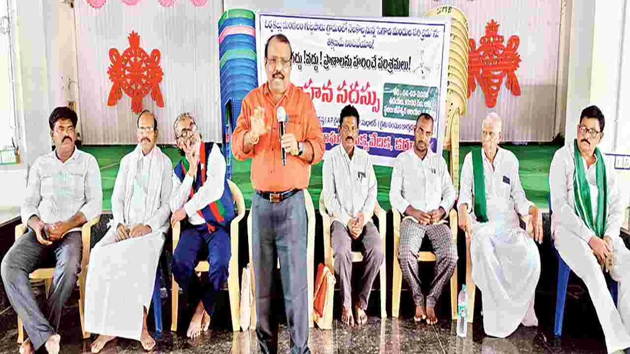 ఓర్వకల్లు, మార్చి 4 (ఆంధ్రజ్యోతి): మండలంలోని గుట్టపాడు సమీపంలో నెలకొల్పనున్న బల్క్ డ్రగ్స్ పరిశ్రమను తక్షణమే నిలిపివేయాలని ప్రజాస్వామ్య సంఘాల ఐక్యవేదిక డిమాండ్ చేసింది. బుధవారం ఓర్వకల్లులోని జీవేశ్వరస్వామి కల్యాణ మండపంలో ప్రాణాంతక పరిశ్రమలతో కలిగే నష్టాలపై అవగాహన సదస్సు నిర్వహించారు. దీనికి రైతు సంఘం జిల్లా ప్రధాన కార్యదర్శి రామకృష్ణ అధ్యక్షత వహించారు. ముఖ్యవక్తలుగా జాతీయ అణు ఒప్పంద వ్యతిరేక కార్యవర్గ సభ్యుడు రవీంద్ర శర్మ, ప్రజాస్వామ్య సంఘాల ఐక్యవేదిక కన్వీనర్ రామకృష్ణారెడ్డి, రైతు సంఘం నాయకులు సుధాకర్, రాయలసీమ సాగునీటి సాధన సమితి జిల్లా ఉపాధ్యక్షుడు వాడాల చంద్రశేఖర్రెడ్డి, రైతు కూలి సంఘం నాయకులు సుంకన్న హాజరయ్యారు. రవీంద్రశర్మ మాట్లాడుతూ గుట్టపాడు సమీపంలో నెలకొల్పనున్న బల్క్ డ్రగ్స్ పరిశ్రమతో పర్యావరణ సమస్యలు ఎదురవుతాయన్నారు. రాష్ట్ర ప్రభుత్వం అన్ని నిబంధనలను ఉల్లంఘించి గుట్టపాడులో సిగాచి పరిశ్రమకు అనుమతులు మంజూరు చేయడం మంచిది కాదన్నారు. తక్షణమే పర్యావరణ కాలుష్య నియంత్రణ మండలి జోక్యం చేసుకుని అనుమతులు రద్దు చేయాలని డిమాండ్ చేశారు. రత్నం, ఏసేపు, అబ్దుల్ వాహీద్, విజయభాస్కర్, రాధాకృష్ణ, షాజహాన, యోహాన, చంద్రబాబు నాయుడు, వెంకటేశ్వర్లు, నాగన్న, కరీంబాషా పాల్గొన్నారు.