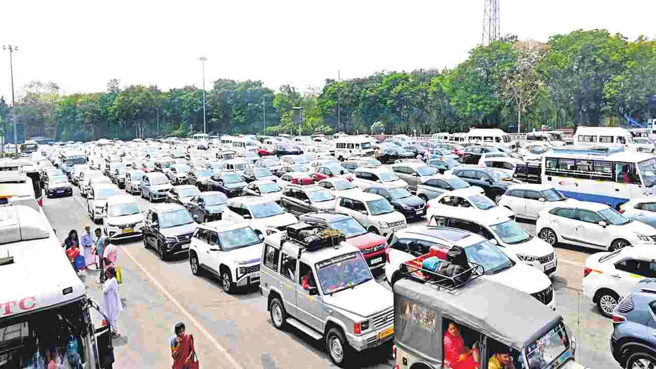 తిరుమల, ఏప్రిల్ 6(ఆంధ్రజ్యోతి): తిరుమల కొండకు వాహనాలు క్యూ కడుతున్నాయి. గడచిన 3రోజుల్లో దాదాపు 33 వేల వాహనాలు తిరుమలకు చేరుకున్నాయి. చాలామంది భక్తులు సొంత వాహనాల్లోనే తిరుమలకు వస్తున్న క్రమంలో నిత్యం అలిపిరి చెక్పాయింట్ వాహనాలతో కిక్కిరిసిపోతోంది. గరుడ సర్కిల్ నుంచి తనిఖీ కేంద్రం వరకు బంపర్ టూ బంపర్ నెమ్మదిగా కదులుతూ కనిపిస్తున్నాయి. రోజూ పది వేలకు తగ్గకుండా వాహనాలు కొండెక్కుతున్నాయి. గత శుక్ర, శని, ఆదివారాల్లో 33 వేల వాహనాల్లో భక్తులు తిరుమలకు చేరుకున్నారు. వారాంతంతో సంబంధం లేకుండా సోమవారం కూడా అధిక వాహనాలతో అలిపిరి తనిఖీ కేంద్రం రద్దీగా మారింది. మరోవైపు వాహనాలు పెరిగిన క్రమంలో ఆర్టీసీ బస్సుల్లో వచ్చే భక్తులు కొంత ఇబ్బందులకు గురవుతున్నారు. బస్సులు ఒకదాని వెనుక మరొకటి క్యూ కడుతున్నాయి. దీంతో తనిఖీల కోసం దిగి వెళ్లాలని బస్సు సిబ్బంది సూచిస్తున్నారు. దీంతో చాలా మంది భక్తులు తీవ్ర ఎండలో చిన్నపిల్లలు, లగేజీతో చెమటలు కక్కుతూ నడిచి వెళుతున్నారు. వృద్ధులకూ ఇబ్బందులు తప్పడం లేదు.
