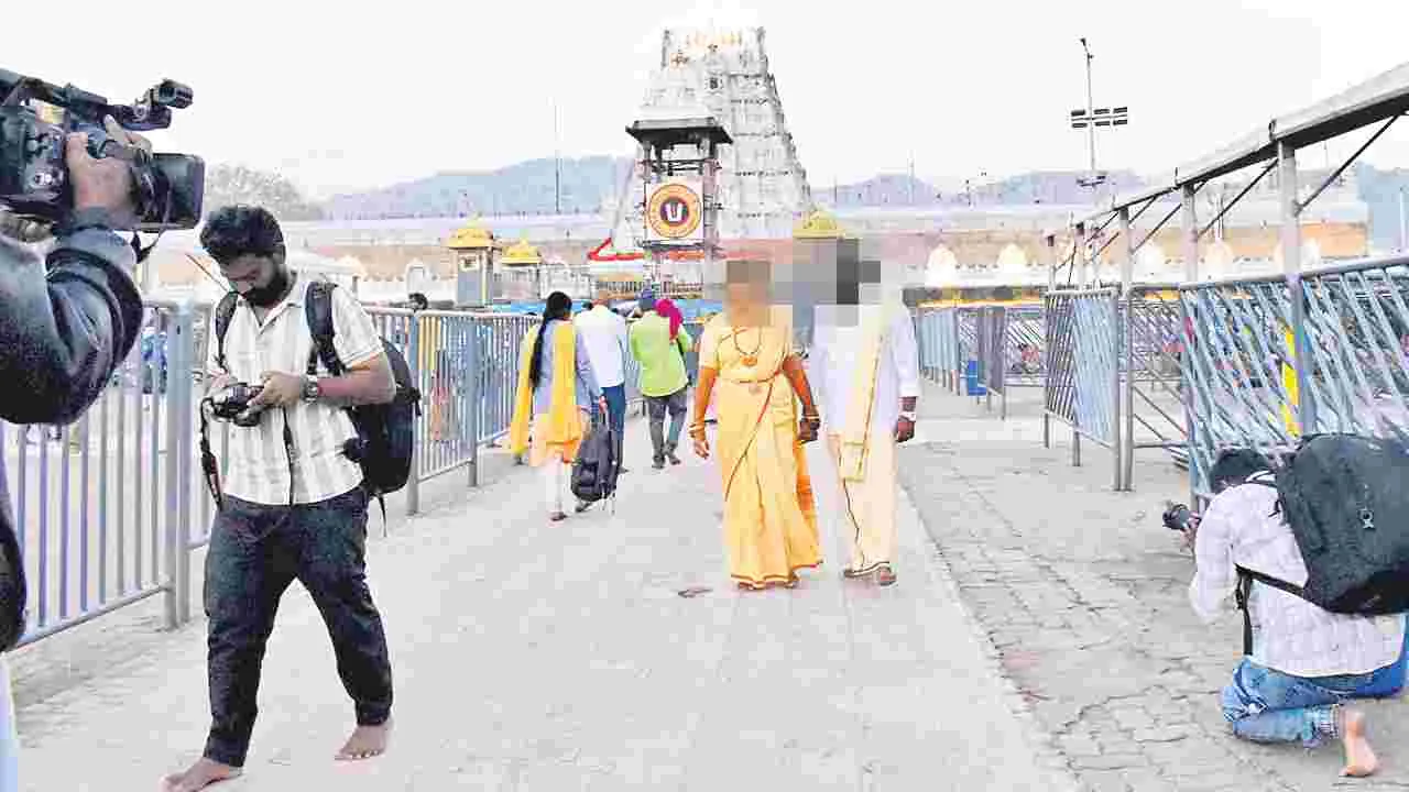 తిరుమల, జనవరి 28 (ఆంధ్రజ్యోతి): ఎన్ని హెచ్చరికలు చేసినా తిరుమలలో ‘నిషేధ’ ఉల్లంఘనలు తరచూ జరుగుతూనే ఉన్నాయి. కొందరు అత్యుత్సాహంతో చేసే చర్యలు భక్తులకు మనస్తాపం కలిగిస్తున్నాయి. తాజాగా తిరుమల శ్రీవారి ఆలయం ముందు ఒక జంట ఫొటో షూట్ చూసి భక్తులు విస్తుపోయారు. బుధవారం ఉదయం పెళ్లి దుస్తుల్లో ఉన్న జంట గొల్లమండపానికి అతి సమీపంలో ఫొటో షూట్లో పాల్గొన్నారు. ప్రత్యేక లైట్ల వెలుగులో షూటింగ్ జరిగింది. ఈ క్రమంలో నుదుటిపై ముద్దులు పెట్టుకుంటున్న వీడియోలు, ఫొటోలు తీశారు. గొల్లమండపం నుంచి అఖిలాండం వరకు నడుస్తూ ఫోజులిచ్చారు. ఆలయ ప్రాంగణంలో ఇటువంటివి నిషేధం, అయితే భద్రతా సిబ్బంది ఎవరూ వీరిని అడ్డుకోకపోవడం గమనార్హం.