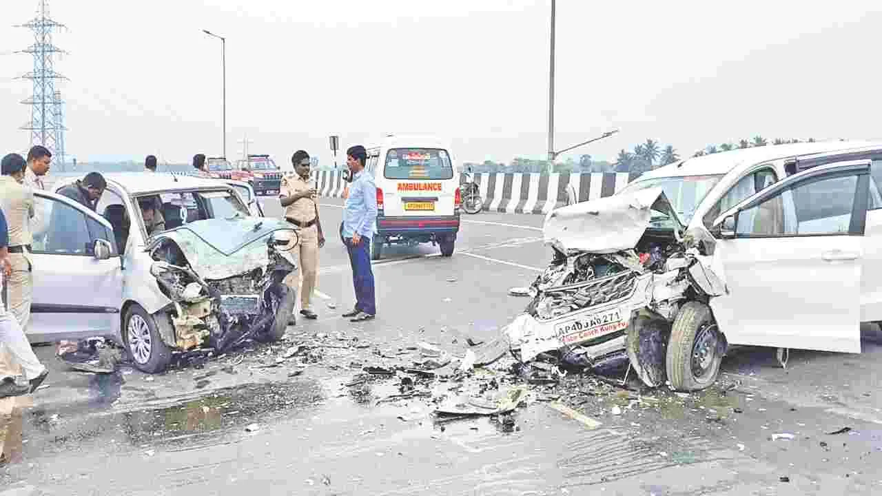 దేవరపల్లి/ఏలూరు క్రైం, మార్చి 22 (ఆంధ్ర జ్యోతి): ఓ కారు డ్రైవర్ నిద్రమత్తు ముగ్గురి ప్రాణాలను మింగేసింది. తూర్పుగోదావరి జిల్లా దేవరపల్లి మండలం యర్నగూడెం బైపాస్ ఫ్లైఓవర్ వద్ద ఆదివారం ఉదయం 7 గంటలకు ఓ కారు వేగంగా వెళ్తూ.. మరో రెండు కార్లను ఢీకొంది. ఈ ఘటనలో ముగ్గురు మృతిచెందగా మరో నలుగురికి తీవ్రగాయాలయ్యాయి. ఎస్ఐ సుబ్రహ్మణ్యం కథనం ప్రకారం.. కాకినాడకు చెందిన సిరియాదుల సత్యనారాయణ (53), కాకినాడ జిల్లా జగ్గంపేట మండలం మల్లిసాల గ్రామానికి మామిడాల నారాయణమూర్తి (52), మరికొందరు ఎర్రచందనం మొక్కల కోసం ఆదివారం తెల్లవారుజామును కాకినాడ నుంచి ఏలూరు జిల్లా కణిగిరికి యెర్టిగా కారులో బయలు దేరారు. యర్నగూడెం బైపాస్ ఫ్లై ఓవర్ వద్దకు వచ్చేసరికి.. డ్రైవింగ్ చేస్తున్న కాకినాడ సర్పవరం జంక్షన్కు చెందిన బల్లా చిట్టిబాబు కారు నడుపుతుండగా.. నిద్రమత్తులో అదుపుతప్పి డివైడర్ దాటుకుని అవతలి రోడ్డులోకి దూసుకుపోయిం ది. ఆ రోడ్డులో ఏలూరు, రాజహేంద్రవరం నుంచి వస్తున్న రెండు కార్లను ఢీకొంది. అందులో ఒక కారులో ఉన్నవారికి ఏం కాలేదు. మరో కారులో ఉన్న ఏలూరు తం గెళ్ళమూడి ప్రాంతానికి చెందిన మహ్మద్ సలీం సిస్టి (44) మృతిచెంచాడు. శనివారం కుటుంబీకులతో రంజాన్ పండుగ చేసుకుని ఆదివారం ఉదయం ఆనందంగా ఇంటి నుంచి బయలుదేరిన కాసేపటికే మృత్యువాతపడినట్టు కుటుంబీకులకు సమాచారం అందడంతో వారు కన్నీరుమున్నీరుగావిలపించారు. ప్రమాదానికి కారణమైన యెర్టిగా కారులో ఉన్న సిరియాదులసత్యనారాయణ, మామిడాల నారా యణమూర్తి అక్కడికక్కడే మృతిచెందారు. కాకినాడ సర్పవరం జంక్షన్కు చెందిన డ్రైవర్ బల్లా చిట్టిబాబు సహా, మరో ముగ్గురికి తీవ్ర గాయాలయ్యాయి. సీఐ బీఎన్.నాయక్ సిబ్బందితో ఘటనా స్థలాన్ని పరిశీలించి, కేసు దర్యాప్తు చేపట్టారు.