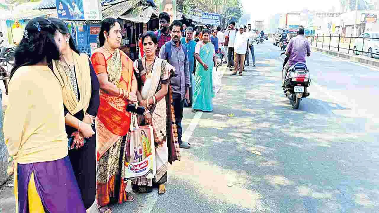 బస్సుల కోసం రోడ్డుపై నిరీక్షణ