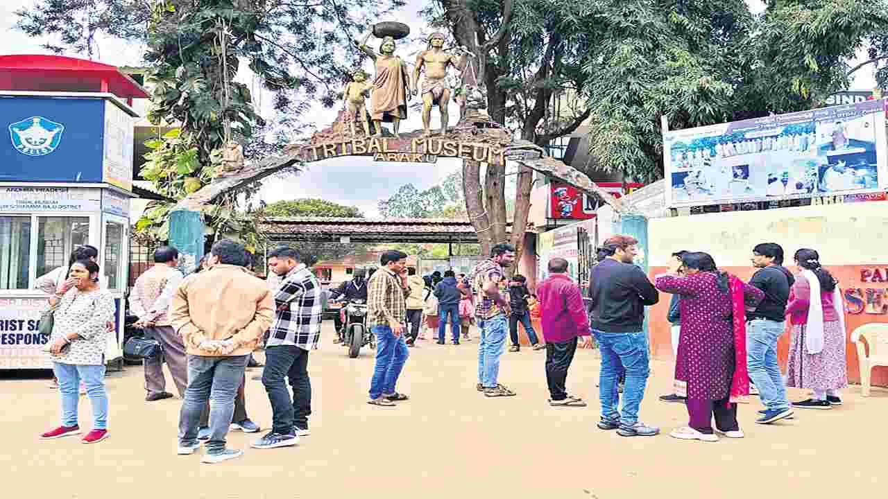 అరకులోయ: వాతావరణం ఆహ్లాదకరంగా ఉండడంతో అరకులోయలోని పర్యాటక ప్రాంతాలను అధిక సంఖ్యలో పర్యాటకులు సందర్శించారు. వేకువజామున మంచు, ఆ తరువాత చిరుజల్లులు పడడంతో వాతావరణాన్ని పర్యాటకులు ఎంజాయ్ చేశారు. గిరిజన మ్యూజియం, పద్మాపురం గార్డెన్, సుంకరమెట్ట ఉడెన్బ్రిడ్జి, గాలికొండ వ్యూపాయింట్ను పర్యాటకులు సందర్శించారు. ఉదయం 11 గంటల సమయంలో ఉడెన్బ్రిడ్జి వద్ద, సుంకరమెట్ట సంత వద్ద ట్రాఫిక్కు అంతరాయం కలిగింది. పోలీసులు ట్రాఫిక్ను క్రమబద్ధీకరించడంతో యథావిధిగా రాకపోకలు సాగాయి.