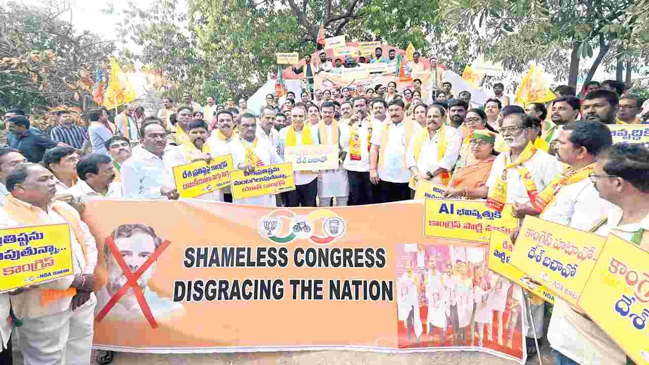 బీజేపీ రాష్ట్ర అధ్యక్షుడు మాధవ్ మాట్లాడుతూ దేశ ప్రతిష్టను దెబ్బ తీసేలా కాంగ్రెస్ పార్టీ దిగుజారుడు రాజకీయాలు చేయడం సిగ్గుచేటన్నారు. గూగుల్ సెంటర్తో విశాఖపట్నం ప్రపంచంలో గ్లోబల్ హబ్గా మారుబోతుందని సుందర్ పిచాయ్ సమ్మిట్లో ప్రస్తావించారని, అది మనకు గర్వకారణమన్నారు. కాంగ్రెస్ పార్టీ నీచరాజకీయాలు దేశాభివృద్ధికి ఆటంకంగా మారుతున్నాయన్నారు. ఏఐతో జరగనున్న కొత్త ఆవిష్కరణలను కాంగ్రెస్ జీర్ణించుకోలేకపోతుందన్నారు. ప్రజలకు నష్టం చేకూర్చేలా వ్యవహరిస్తున్న ఆ పార్టీ చర్యలను తిప్పికొడతామని నార్త్ ఎమ్మెల్యే విష్ణుకుమార్రాజు అన్నారు. ఈ కార్యక్రమంలో టీడీపీ పార్లమెంట్ అధ్యక్షుడు పట్టాభి, ఎన్టీఆర్ ఆరోగ్య ట్రస్టు చైర్మన్ సీతంరాజు సుధాకర్, జనసేన నాయకులు శివ ప్రసాద్, బీజేపీ నాయకులు దామోదర్ యాదయ్, కూటమి నాయకులు పాల్గొన్నారు. ఈ సందర్భంగా కాంగ్రెస్ పార్టీకి వ్యతిరేకంగా పెద్దఎత్తున నినాదాలు చేశారు. తొలుత మహాత్మాగాంధీ విగ్రహానికి పల్లా శ్రీనివాసరావు, మాధవ్ పూలమాలలు వేసి, నివాళులు అర్పించారు.