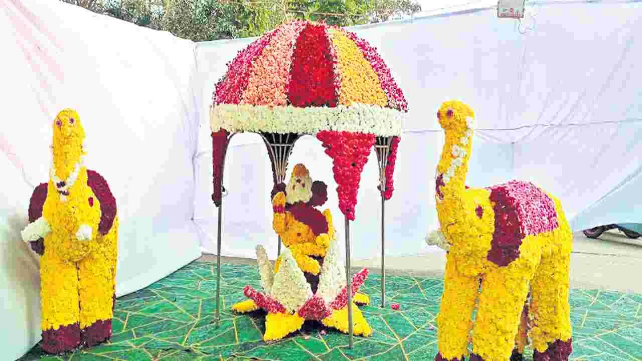 అనకాపల్లి ఎన్టీఆర్ మార్కెట్ యార్డులో భారీ ఎత్తున పుష్ప ప్రదర్శన ఏర్పాటు చేస్తున్నారు. గురువారం రాత్రికి ఏర్పాట్లు, అలంకరణలు పూర్తయ్యాయి. ప్రవేశ మార్గం వద్ద వివిధ రకాల పూలతో స్వాగత ద్వారాన్ని ఆకర్షణీయంగా నిర్మించారు. లోపల పూలతో వినాయకుడిని, రెండు వైపులా ఏనుగులను అలంకరించారు. రకకాల పూలతో ప్రేమజంట, డాల్ఫిన్ చేపలు, పెంగ్విన్లు, పుట్టగొడుగుల ఆకృతను ఏర్పాటు చేశారు. పచ్చని ఆకులతో శివలింగం, ఏనుగు, ఒంటెలు, జింకలను తీర్చిదిద్దారు. నూకాంబిక అమ్మవారి సైకత శిల్పాన్ని ఏర్పాటు చేశారు.