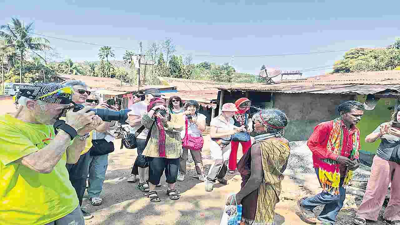 ముంచంగిపుట్టు, మార్చి 5 (ఆంధ్రజ్యోతి): ఆంధ్రా, ఒడిశా సరిహద్దు ప్రాంతంలో గల ఒనకఢిల్లీ వారపు సంతలో గురువారం విదేశీ పర్యాటకులు సందడి చేశారు. ఇటలీ దేశానికి చెందిన పర్యాటకులు సంతకు అధిక సంఖ్యలో తరలి వచ్చారు. సంతలో అటూ ఇటూ తిరిగారు. అలాగే బొండా జాతీయులను విదేశీ పర్యాటకులు తమ కెమెరాలో బంధించారు. సంతలో వారు తీసుకువచ్చిన పలు రకాల వస్తువులను ఆసక్తిగా తిలకించి, వాటిని కొనుగోలు చేశారు. విదేశీయులతో ఫొటోలు దిగేందుకు స్థానికులు ఉత్సాహం చూపించారు. అలాగే విదేశీ పర్యాటకులు మాచ్ఖండ్ ప్రాజెక్టు పరిధిలో గల డుడుమ జలపాతం, వ్యూ పాయింట్ను సందర్శించారు. ప్రకృతి అందాలకు వారు ఫిదా అయ్యారు. మరో మూడు రోజుల పాటు ఈ ప్రాంతంలో ఉండి ప్రకృతి అందాలను తిలకిస్తామని వారు తెలిపారు.