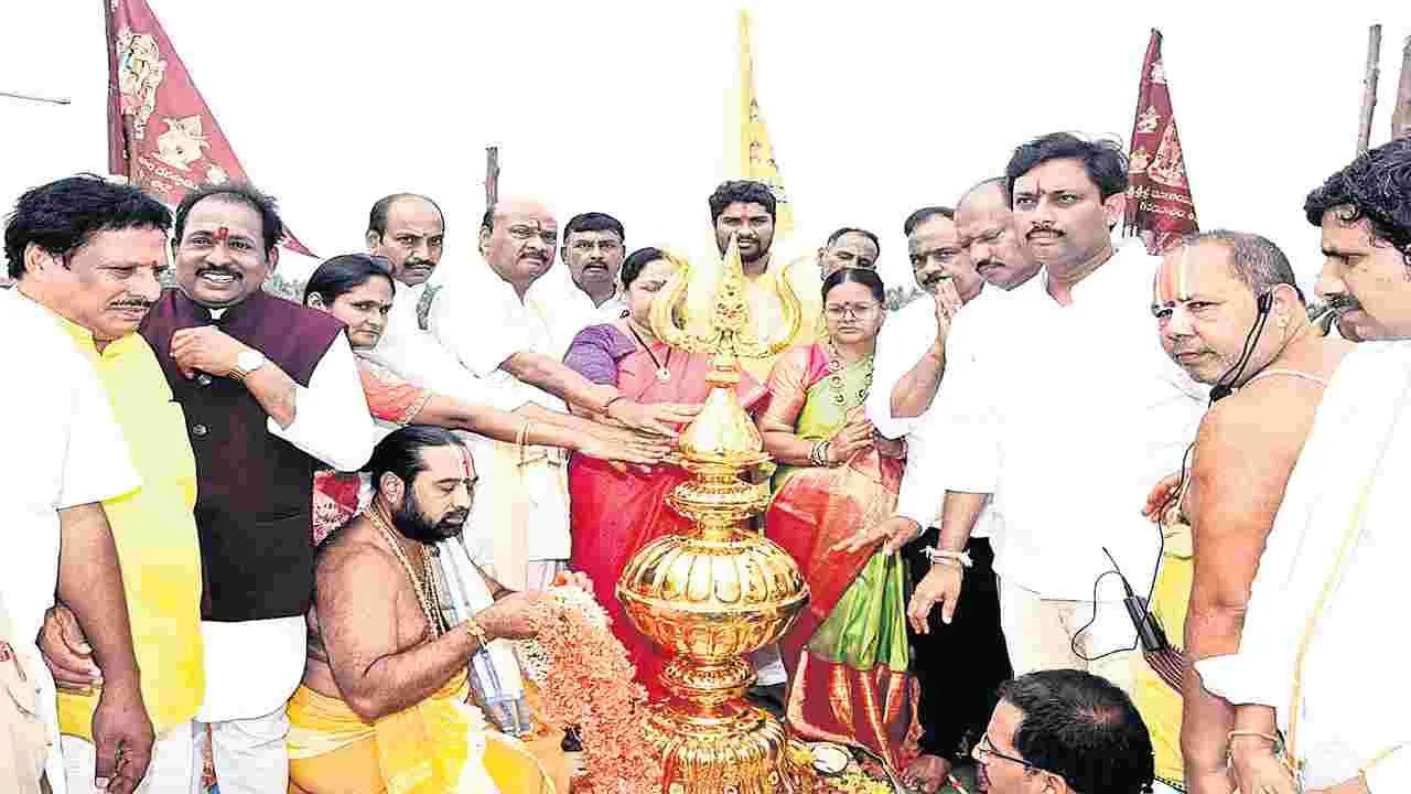 కొత్తూరు (అనకాపల్లి), మార్చి 8 (ఆంధ్రజ్యోతి): స్థానిక నూకాంబిక అమ్మవారి నూతన ఆలయంపై పసిడి కలశం, రాజగోపురంపై నవకలశాల ప్రతిష్ఠాపన మహోత్సవాలను ఆదివారం భక్తిశ్రద్ధలతో అంగరంగ వైభవంగా నిర్వహించారు. ఈ కార్యక్రమంలో శాసనసభాపతి చింతకాయల అయ్యన్నపాత్రుడు, ఎంపీ సీఎం రమేశ్ దంపతులు పాల్గొన్నారు. అంతకుముందు ఆలయానికి వచ్చిన వీరికి ఎమ్మెల్యే కొణతాల రామకృష్ణ ఆధ్వర్యంలో ఆలయ అర్చకులు పూర్ణకుంభంతో స్వాగతం పలికారు. అనంతరం పునర్నిర్మించిన ప్రధాన ఆలయ మండపంలో నిర్వహించిన పసిడికలశాల నీరాజనం కార్యక్రమంలో పాల్గొన్నారు. అనంతరం అమ్మవారికి పసుపు, కుంకుమ, పట్టు వస్ర్తాలు సమర్పించి విశేష పూజలు నిర్వహించారు. గతంలో బాలాలయంలో ప్రాణప్రతిష్ఠ చేసిన శక్తియంత్రాన్ని ప్రధాన ఆలయంలోకి తీసుకువచ్చి ప్రతిష్ఠించారు. ప్రధాన ఆలయ గోపురంపై పసిడి కలశ ప్రష్ఠాపనలో పాల్గొని బూరెలు, పువ్వులతో అభిషేకాలు చేశారు. ఆలయానికి తూర్పువైపున కొత్తగా నిర్మించిన తొమ్మిది అంతస్థుల రాజగోపురంపైన తొమ్మిది కళశాలను ప్రతిష్ఠించి పూజలు చేశారు. ఈ కార్యక్రమాల్లో ఏపీయూఎఫ్ఐడీసీ చైర్మన్ పీలా గోవింద సత్యనారాయణ దంపతులు, ఎలమంచిలి ఎమ్మెల్యే సుందరపు విజయ్కుమార్, ఎమ్మెల్సీ వేపాడ చిరంజీవిరావు దంపతులు, కార్పొరేషన్ల చైర్మన్లు బత్తుల తాతయ్యబాబు, మళ్ల సురేంద్ర, పీవీజీ కుమార్, డీసీఎంఎస్ చైర్మన్ కోట్ని బాలాజీ, మాజీ ఎమ్మెల్సీ బుద్ద నాగజగదీశ్వరరావు, జనసేన పార్టీ నియోజకవర్గం ఇన్ఛార్జి భీమరశెట్టి రామకృష్ణ (రాంకీ) దంపతులు, జీవీఎంసీ మేయర్ పీలా శ్రీనివాసరావు, దేవస్థానం చైర్మన్ పీలా నాగశ్రీను (గొల్లబాబు), దేవాదాయ శాఖ ఆర్జేసీ వేండ్ర త్రినాథరావు, డీసీ సుజాత, ఏసీ సుధారాణి, ఈవో ఎ.శ్రీధర్, ధర్మకర్తలు పాల్గొన్నారు.