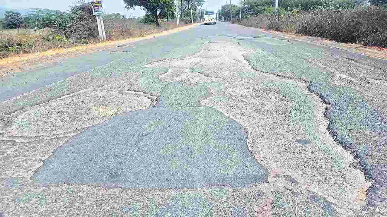 రాంబిల్లి, మార్చి 5 (ఆంధ్రజ్యోతి): అచ్యుతాపురం నుంచి ఎలమంచిలి వెళ్లే ప్రధాన రహదారిలో రాంబిల్లి మండల పరిధిలోని వెంకటాపురం జంక్షన్ నుంచి కొత్తూరు వరకు సుమారు మూడు కిలోమీటర్ల మేర పలుచోట్ల భారీ గోతులు ఏర్పడ్డాయి. అచ్యుతాపురం సెజ్, పరవాడ మండలంలోని ఫార్మాసిటీ, ఇతర పరిశ్రమలు, రాంబిల్లి మండలంలోని ఎన్ఏవోబీకి వివిధ రకాల వస్తుసామగ్రితో తుని వైపు నుంచి వచ్చే భారీ వాహనాలు ఎలమంచిలి నుంచి ఈ మార్గంలోనే వస్తుంటాయి. దీంతో నిత్యం వేలాది వాహనాల రాకపోకలతో ఈ రోడ్డు రద్దీగా వుంటున్నంది. అయితే ఆర్అండ్బీ పరిధిలోని ఈ రహదారి నిర్వహణ పనులను అధికారులు ఏడాది నుంచి చేపట్టకపోవడంతో గోతులు నానాటికీ పెద్దవి అవుతున్నాయని వాహనదారులు ఆరోపిస్తున్నారు. పలుచోట్ల రోడ్డు మొత్తం ఛిద్రమైంది. కొన్నిచోట్ల రహదారి మధ్యలో గోతులు వున్నాయి. వీటిని తప్పించే క్రమంలో వాహనాలు ప్రమాదాలకు గురవుతున్నాయి. రాత్రిపూట దగ్గరకు వచ్చే వరకు గోతులు కనిపించకపోవడంతో ద్విచక్ర వాహనదారులు ప్రమాదాలబారిన పడుతున్నారు.