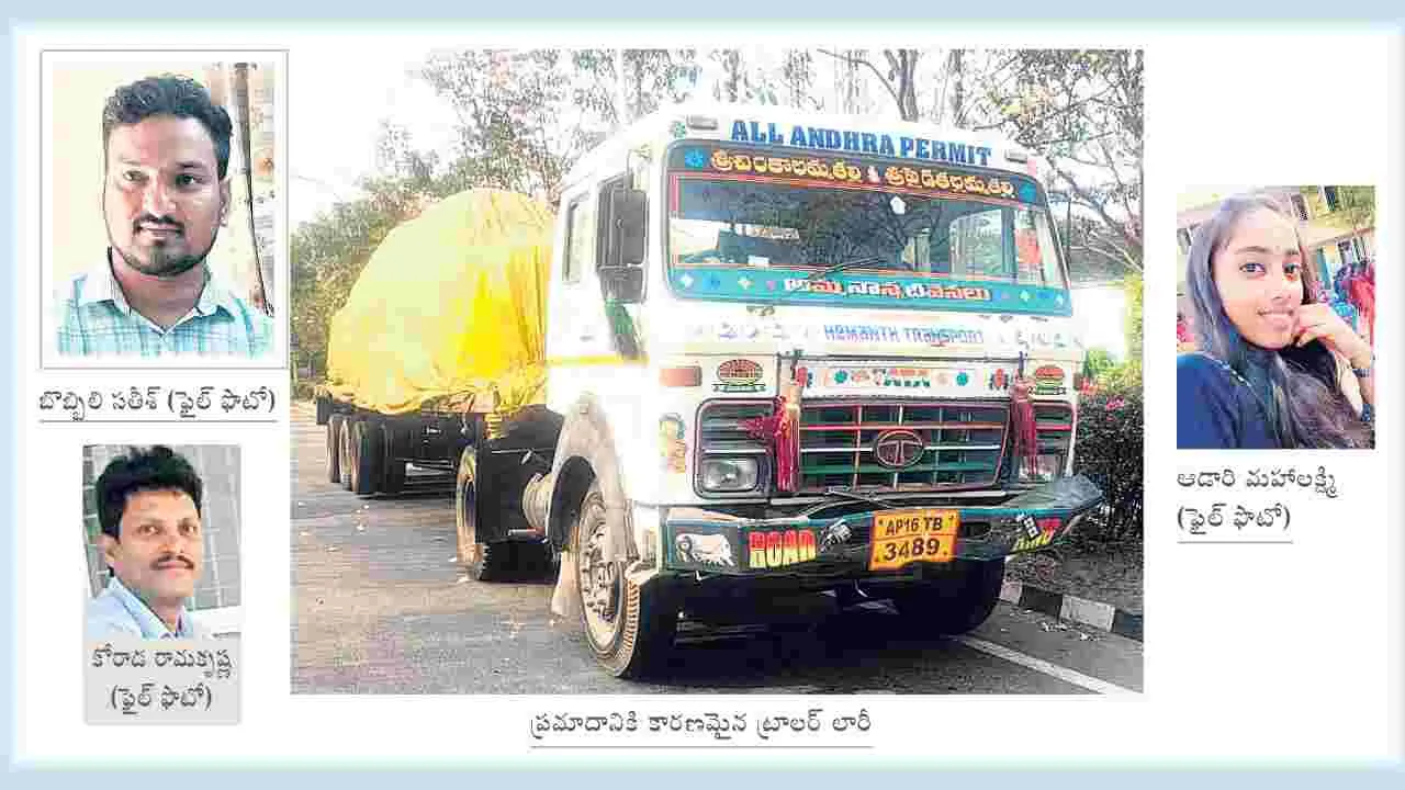 నగరంలోని మారికవలసకు చెందిన బొబ్బిలి సతీశ్ (30) ఒక ఫైనాన్స్ కంపెనీలో ఉద్యోగం చేస్తున్నాడు. గాజువాకకు చెందిన ఒక యువతితో పెళ్లి సంబంధం కుదిరింది. వచ్చే నెల 11వ తేదీన వివాహం చేయాలని నిశ్చితార్థం చేసుకున్నారు. ఈ నేపథ్యంలో పెళ్లి ఏర్పాట్లకు సంబంధించి కాబోయే అత్తింటి వారితో మాట్లాడడానికి సతీశ్ శనివారం గాజువాక వచ్చాడు. రాత్రికి ఇక్కడే వుండి ఆదివారం ఉదయం తిరిగి ద్విచక్ర వాహనంపై మారికవలస బయలుదేరాడు. దారిలో బీహెచ్పీవీ జంక్షన్ వద్ద ట్రాఫిక్ సిగ్నల్ పడడంతో ఆగాడు. మరోవైపు గాజువాక శ్రీనగర్కు చెందిన కోరాడ రామకృష్ణ (50) స్థానిక వరుణ్ మోటర్స్ కంపెనీలో సూపర్ వైజర్గా విధులు నిర్వహిస్తున్నాడు. సోమవారం కుమార్తె అనుపమ పదో తరగతి పరీక్షకు హాజరు కానుండడంతో సింహాచలం వెళ్లి వరాహలక్ష్మీనృసింహస్వామిని దర్శించుకుని పూజ చేయిద్దామని కుమార్తెతో కలిసి ద్విచక్ర వాహనంపై బయలుదేరాడు. బీహెచ్పీవీ జంక్షన్ వద్ద ట్రాఫిక్ సిగ్నల్ పడడంతో ఆగారు. ఇదే సమయంలో గంగవరం పోర్టు నుంచి మెటీరియల్ లోడుతో షీలానగర్ వైపు వెళుతున్న ట్రాలర్ లారీ బీహెచ్పీవీ జంక్షన్లో ట్రాఫిక్ రెడ్ సిగ్నల్ పడినప్పటికీ ఆగకుండా ముందుకు వచ్చి, అప్పటికే ఆగి వున్న మూడు ద్విచక్ర వాహనాలను, ఇన్నోవాను బలంగా ఢీకొని, సుమారు వంద మీటర్ల దూరం వెళ్లింది. ద్విచక్రవాహనంపై వున్న రామకృష్ణ కుడివైపునకు, కుమార్తె అనుపమ ఎడమవైపునకు పడిపోయారు. దీంతో రామకృష్ణ మీద నుంచి లారీ వెళ్లడంతో అక్కడికక్కడే మృతిచెందాడు. ఇదే సమయంలో మరొక ద్విచక్ర వాహనంపై వున్న బొబ్బిలి సతీశ్ (30) మీద నుంచి కూడా లారీ వెళ్లడంతో మృతిచెందాడు. ఈ ప్రమాదంతో రామకృష్ణ కుమార్తె అనుపమ, మరో ద్విచక్ర వాహనంపై వున్న గాజువాకకు చెందిన రవికుమార్, ఇన్నోవా కారులో వున్న వారు స్వల్ప గాయాలతో బయటపడ్డారు.