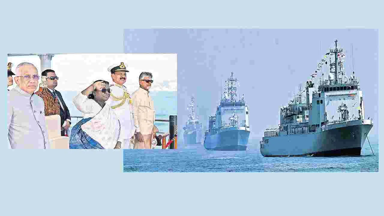 సాగర తీర నగరమైన విశాఖపట్నంలో పెరుగుతున్న యువతకు భారత నౌకాదళమే స్ఫూర్తిదాయకమని రాష్ట్రపతి ద్రౌపది ముర్ము అన్నారు. బంగాళాఖాతంలో బుధవారం ఉదయం అంతర్జాతీయ నౌకాదళ సమీక్ష నిర్వహించిన అనంతరం ఆమె ‘ఐఎన్ఎస్ సుమేధ’ పై నుంచి ప్రజలను ఉద్దేశించి ప్రసంగించారు. క్రమశిక్షణ, దేశభక్తి, సేవాభావం అనేవి మన నావికుల విశేష లక్షణాలని వివరించారు. వాటిని విశాఖ విద్యార్థులు అందిపుచ్చుకోవాలన్నారు. దేశ సేవలో అహర్నిశలూ శ్రమిస్తున్న నౌకాదళ సిబ్బందికి అభినందనలు తెలిపారు. ఈ కార్యక్రమంలో పాల్గొనేందుకు రాష్ట్ర ముఖ్యమంత్రి చంద్రబాబునాయుడు విజయవాడ నుంచి ప్రత్యేకంగా వచ్చారు. ఆయనకు భారత నౌకాదళాధిపతి దినేశ్ త్రిపాఠి స్వాగతం పలికి వేదిక వద్దకు తోడ్కొని వెళ్లారు. అదేవిధంగా ఉప ముఖ్యమంత్రి పవన్కళ్యాణ్ సతీసమేతేంగా విచ్చేయగా వారికి నేవీ అధికారులు స్వాగతం పలికారు. కేంద్ర మంత్రి రామ్మోహన్నాయుడు కూడా సతీసమేతంగా వచ్చి అదే రథంలో సమీక్షకు వెళ్లారు. విశాఖపట్నం ఎంపీ శ్రీభరత్ ఐఎన్ఎస్ సుమిత్రలో రాష్ట్రపతి రథం వెంట సమీక్షకు వెళ్లారు. ఈ కార్యక్రమంలో జిల్లా కలెక్టర్ హరేంధిర ప్రసాద్, సిటీ పోలీస్ కమిషనర్ శంఖబ్రత బాగ్చి, తదితరులు పాల్గొన్నారు.