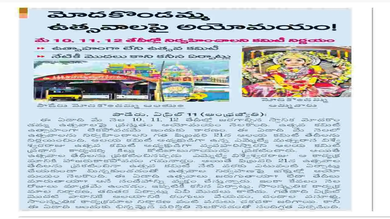 మోదకొండమ్మ ఉత్సవ కమిటీ ఎన్నిక జరిగి సుమారుగా రెండు నెలలైనా ఉత్సవాలకు సంబంధించిన కనీస ఏర్పాట్లు జరగకపోవడం, ఉత్సవ కమిటీ ఉత్సాహంగా లేకపోవడంపై ఈ నెల 12న ‘ఆంధ్రజ్యోతి’లో ‘మోదకొండమ్మ ఉత్సవాలపై అయోమయం’ శీర్షికన కథనం ప్రచురించిన సంగతి పాఠకులకు తెలిసిందే.