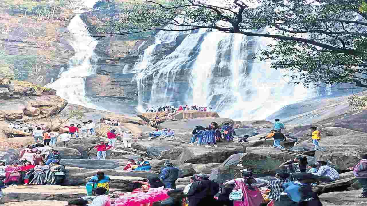 పెదబయలు: మండలంలోని పర్యాటక ప్రాంతాలు సందర్శకులతో కిటకిటలాడాయి. శనివారం వివిధ ప్రాంతాల నుంచి వచ్చిన పర్యాటకులు జామిగూడ పంచాయతీలోని తారాబు జలపాతం వద్ద సందడి చేశారు. పచ్చని అడవుల మధ్య 160 నుంచి 250 అడుగుల ఎత్తైన కొండల నుంచి పాల నురుగలా జాలువారే తారాబు జలపాతం పర్యాటకులను విశేషంగా ఆకట్టుకుంది. ఇది రాష్ట్రంలో రెండో ఎత్తైన జలపాతంగా ప్రసిద్ధి చెందింది. నిత్యం ఇక్కడి వందల సంఖ్యలోను, వీకెండ్ సమయాల్లో వేల సంఖ్యల్లో సందర్శకులు వచ్చి సందడి చేస్తున్నారు.