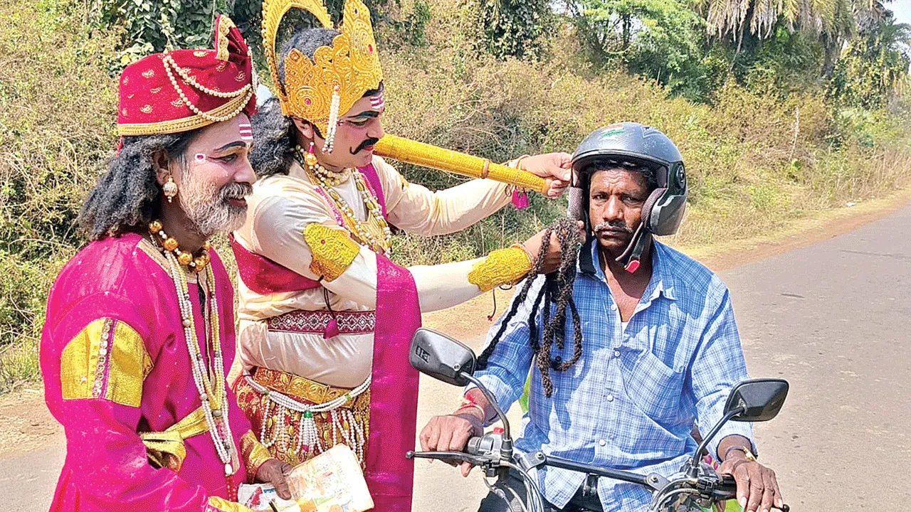 వాహనదారులారా బాధ్యతాయుతంగా వ్యవహరించండి.. మీ కుటుంబ సభ్యులను గుర్తు పెట్టుకుని జాగ్రత్తగా బండి నడపండి.. ముఖ్యంగా హెల్మెట్ ధరించండి.. కోరి నన్ను పిలవకండి’ అంటూ యమధర్మరాజు వేషధారి గేదెల కరుణ్కుమార్ కోరడం అందరినీ ఆకట్టుకుంది. రోడ్డు ప్రమాదాల నివారణపై వాహనదారులకు అవగాహన కల్పించేందుకు ఆదివారం వినూత్నంగా ప్రయత్నించారు. యమధర్మరాజు వేషాన్ని ధరించి స్థానిక కాలేజీ రోడ్డు జంక్షన్లో ప్రతి వాహనదారుతో మాట్లాడారు. తనకు చిత్రగుప్తుని వేషధారణలో ఎం.బూర్జివలస గ్రామానికి చెందిన జనార్దన్ సహకరించారు.