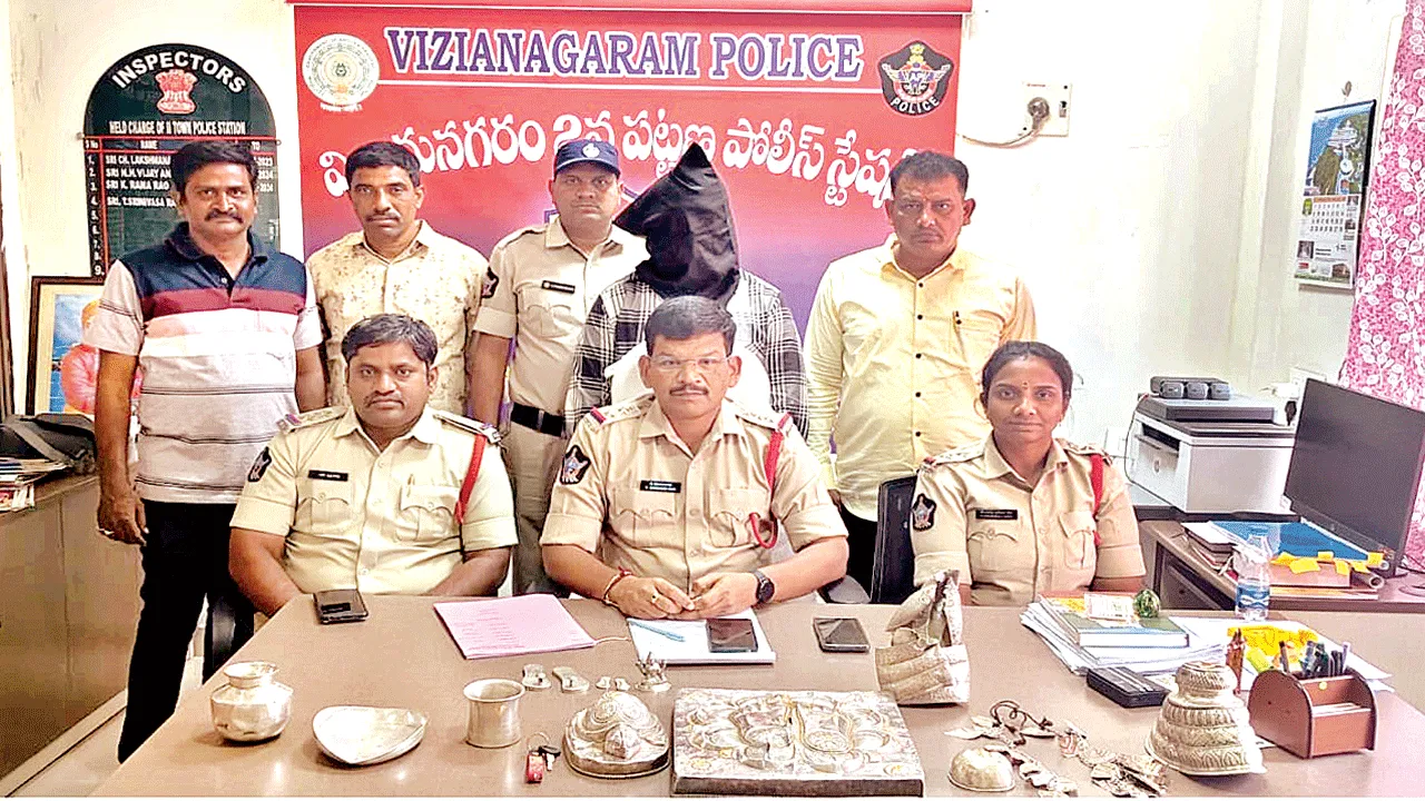 విజయనగరం టూటౌన్ పోలీ సు స్టేషన్ పరిధిలోని ఆలయాల్లో దొంగతనాలకు పాల్పడుతున్న వ్యక్తిని అరెస్టు చేసి, 2.5 కిలోల వెండి ఆభరణాలను స్వాధీనం చేసుకున్నట్టు టూటౌన్ సీఐ శ్రీనివాసరావు తెలిపారు.
