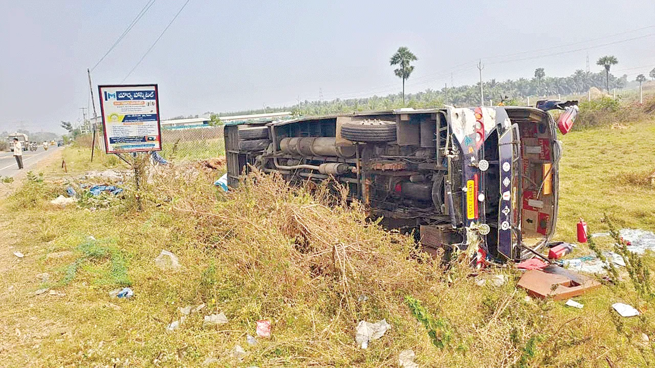 గొల్లప్రోలు రూరల్, జనవరి 19 (ఆంధ్రజ్యోతి): కాకినాడ జిల్లా గొల్లప్రోలు మండలంలోని చేబ్రోలు శివారు జాతీయ రహదారి చెంతనే ఓ ప్రైవేటు ట్రావె ల్స్ బస్సు బోల్తా పడిన ఘటనలో శ్రీకాకుళం, విజయనగరం జిల్లాలకు చెందిన ముగ్గురికి గాయాలయ్యాయి. శ్రీకాకుళం నుంచి భీమవరానికి విజయకృష్ణ ట్రావెల్స్కు చెందిన స్లీపర్ బస్సు ఆదివారం రాత్రి బయలుదేరింది. సోమవారం తెల్లవారుజామున 2గంటల సమయంలో కాకినాడ జిల్లా కత్తిపూడి దాటి చేబ్రోలు శివారు సత్తెమ్మతల్లి ఆలయం వద్దకు వచ్చేసరికి అదుపు తప్పి 216వ జాతీయ రహదారి చెంతనే ఉన్న పోల్స్ను ఢీకొని బోనస్ రాజులుకు చెందిన పంటపొలాల్లోకి బోల్తా పడింది. ప్రయాణికులంతా గాఢనిద్రలో ఉండడంతో ఒక్కరికిగా భయాందోళనకు గురై కేకలు వేశారు. ఈ బస్సు వెనుకే వస్తున్న ఆర్టీసీ బస్సు ఆ శబ్దం విని ఆపి వేశారు. ప్రయాణికులతో కలిసి వెళ్లి ట్రావెల్స్ బస్సు అద్దాలు పగులకొట్టి అందులో ఉన్న ప్రయాణికులను బయటకు తీశారు. ప్రమాద సమయంలో బస్సులో 24 మంది ప్రయాణికులు ఉన్నారు. వారిలో శ్రీకాకుళం జిల్లా కోటబొమ్మాళి ప్రాంతానికి చెందిన బెహరా రవికుమార్, సీహెచ్.రవిళి, విజయనగరం జిల్లా బొబ్బిలికి చెందిన ఓ.ప్రియాంకలతోపాటు వివిద జిల్లాల చెందిన 11మందికి గాయాలయ్యాయి. వారిని హైవే అంబులెన్స్లో హైవే పోలీసులు పిఠాపురం ప్రభుత్వాసుపత్రికి తరలించారు. చికిత్స అనంతరం వేర్వేరు బస్సుల్లో వారి స్వస్థలాలకు పంపారు. వారంతా సంక్రాంతి పండుగకు వెళ్లి తిరిగి వస్తున్నట్టు సమాచారం. సంఘటనా స్థలా న్ని పిఠాపురం సీఐ జి.శ్రీనివాస్, గొల్లప్రోలు ఎస్ఐ ఎన్.రామకృష్ణ, మోటార్ వెహికల్ ఇనస్పెక్టర్ గౌరీశంకర్ పరిశీలించారు. ప్రైవేట్ ట్రావెల్స్ బస్సు కండిషన్ను తనిఖీ చేశారు.