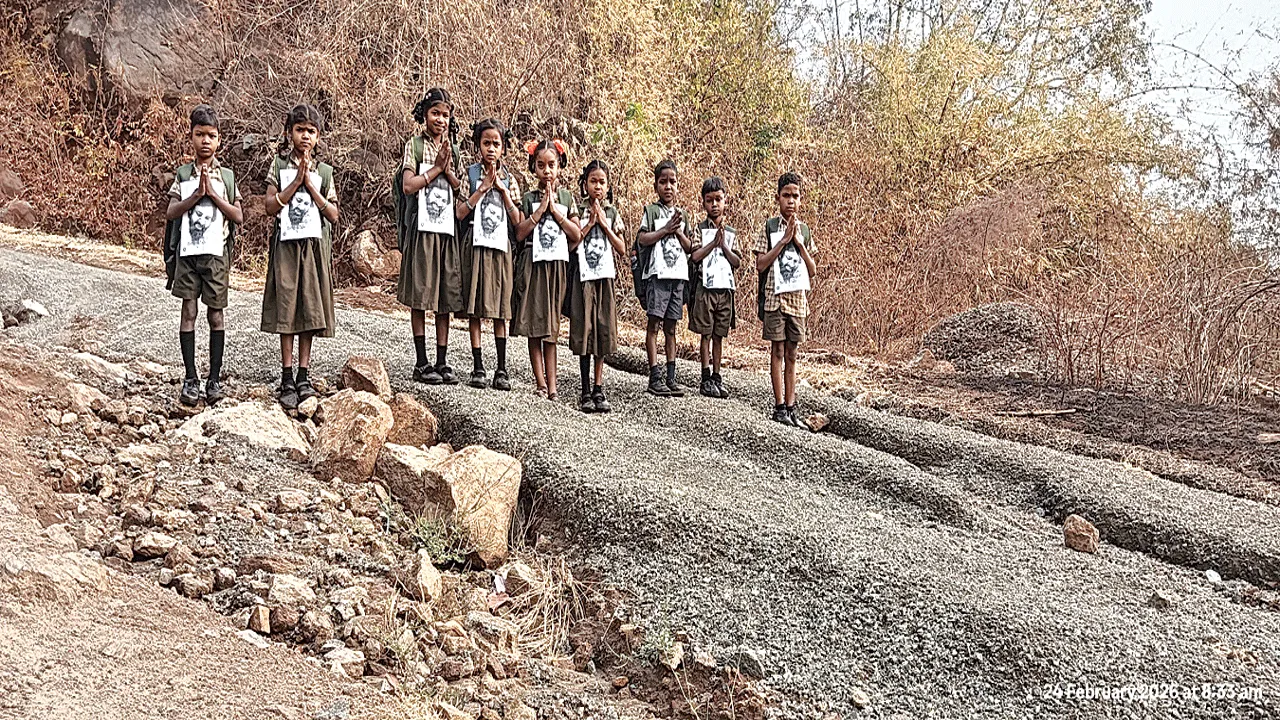 ‘రాయపాలెం, మునపురాయి, చప్పని గెడ్డ, విప్పమాను వలస, పల్లపు దుంగాడ కొండ శిఖర గ్రామాల్లో నివసించే గిరిజన పిల్లలం. కొండ దిగువన 12 కిలోమీటర్ల దూరంలో ఉన్న కాపుసోంపురం ప్రభుత్వ పాఠశాలలో 15 మంది వరకు చదువుకుంటున్నాం. రోజూ నడిచి వెళ్లే మాకు ఈ రోడ్డును బాగు చేయండి. రాళ్లపిక్కలు పరిచి వదిలేయడంతో బూట్లు కిందభాగం నుంచి పాదాలకు రాళ్లు గుచ్చుకుంటున్నాయి. సరిగా నడవలేక జారిపోతూ గాయపడుతున్నాం. గ్రామ పెద్దలు, నాయకులు, ప్రజాప్రతినిధులు, అధికారులు ఈ రోడ్డుకోసం ఏమీ చేయలేకపోతున్నారు. మేమెవరికి చెప్పుకోవాలో తెలియక మీ ఫొటోను మెడకు తగిలించుకొని వేడుకుంటున్నాం’