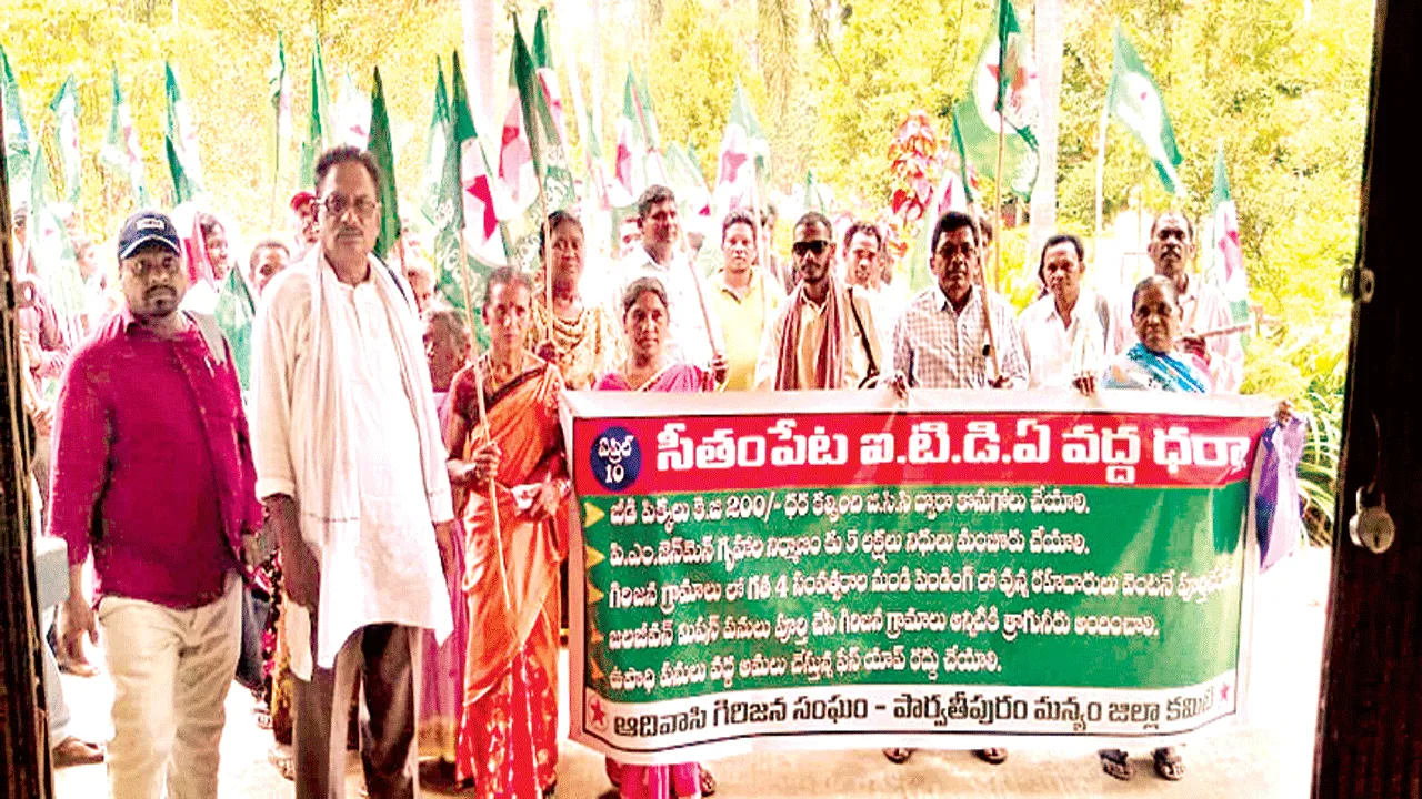 ఫసీతంపేట రూరల్,ఏప్రిల్ 10(ఆంధ్రజ్యోతి): గిరిజనుల సమస్యలను పరిష్కరిం చాలని గిరిజన సంఘ నాయకులు కోరారు. శుక్రవారం ఐటీడీఏ కార్యాలయం ఎదుట ధర్నాచేపట్టారు. తొలుత గిరిజన సంఘం ఆధ్వర్యంలోఐటీడీఏ కార్యాల యం వరకు గిరిజనులు ర్యాలీ చేపట్టారు.అనంతరం సమస్యల పరిష్కారం కోసం నిరసన చేపట్టారు. ఈ సందర్భంగా గిరిజనసంఘం నాయకులు తిరుపతిరావు, లక్ష్మణరావు, శ్రీరాములులు మాట్లాడుతూు జీడిపిక్కలు కేజీకి రూ.200ధర కల్పిం చి జీసీసీ ద్వారా కొనుగోలు చేయాలని కోరారు. అనంతరం వినతిపత్రాన్ని ఐటీడీఏ ఇన్చార్జి పీవో పవార్స్వప్నిల్ జగన్నాథ్ను అందజేశారు.