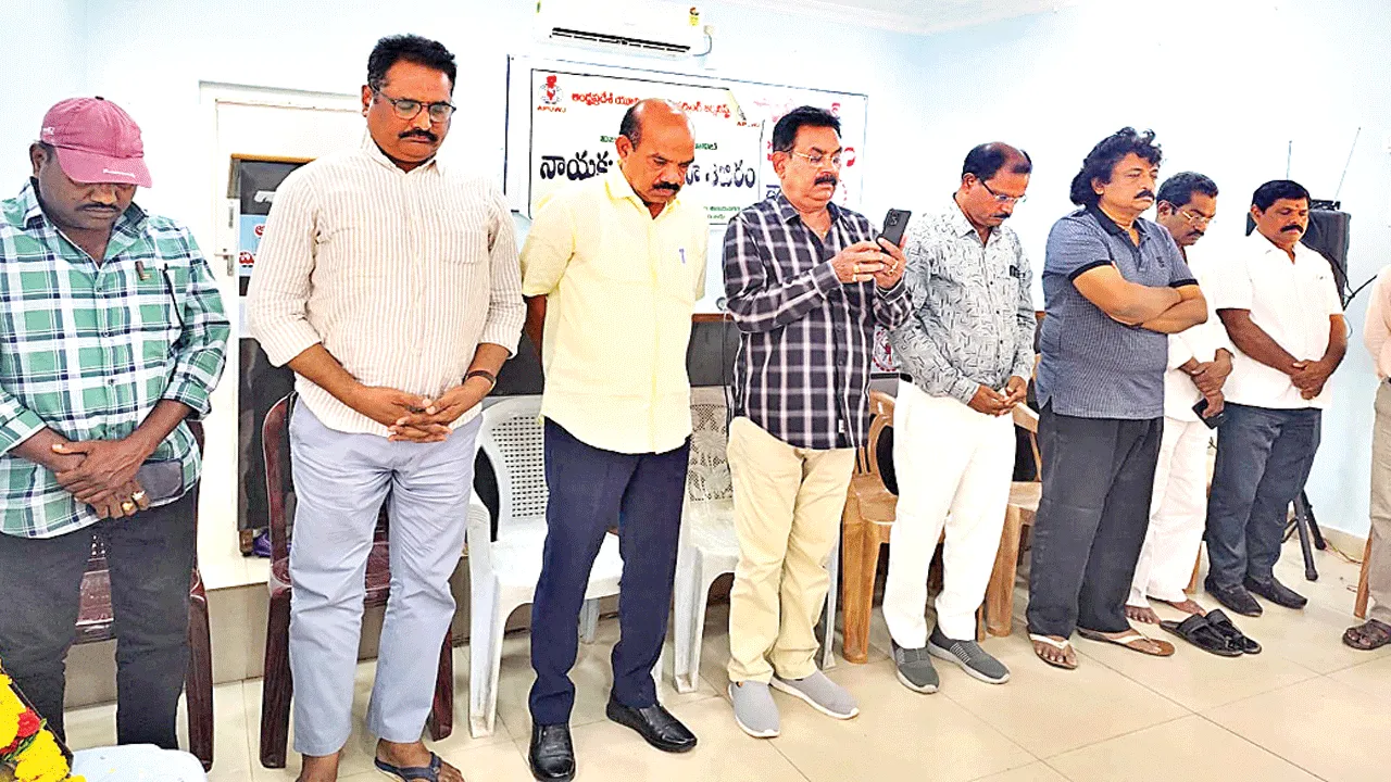 విజయనగరం, కలెక్టరేట్, ఏప్రిల్ 28(ఆంధ్రజ్యోతి): చిత్తూరు జిల్లా వి.కోట ఆంధ్రజ్యోతి రిపోర్టర్ జగన్ను హత్య చేయడాన్ని ఆంధ్రప్రదేశ్ వర్కింగ్ జర్నలిస్టుల యూనియన్(ఏపీయూడబ్ల్యూజే) తీవ్రంగా ఖండించిం ది. యూనియన్ ఆధ్వర్యంలోని పంచాయతీరాజ్ మిని స్టీరియల్ భవనంలో మంగళవారం సమావేశం నిర్వ హించారు. జగన్ హత్యకు నిరసనగా యూనియన్ నా యకులు కాసేపు మౌనం వహించారు. జిల్లా స్థాయిలో ఎటాక్స్ కమిటీలను పునరుద్ధరించాలని కోరారు. రాష్ట్ర డిప్యూటీ జనరల్ సెక్రటరీ శివ ప్రసాద్, యూనియన్ నాయకులు ఎలిశెట్టి సురేష్, లింగాల నర్సింగరావు, పం చాది ఆప్పారావు, ఆరిపాక రాము, ఎంఎస్ఎన్ రాజు, యుగంధర్, రాధాకృష్ణ, సన్యాసిరావులు పాల్గొన్నారు.