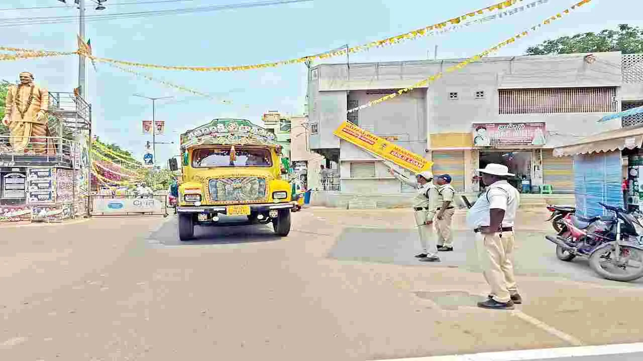 ఏలూరు క్రైం, ఏప్రిల్ 25(ఆంధ్రజ్యోతి):ఏలూరు నగరంలోకి ఉద యం ఎనిమిది నుంచి రాత్రి ఎనిమిది గంటల వరకు భారీ వాహనాలకు అనుమతి లేదని జిల్లా ఎస్పీ కేపీఎస్ కిశోర్ ఆదేశాలు జా రీ చేశారు. నిబంధనలు మీరి ప్రవేశిస్తే వాహన యజమానులపై చట్ట ప్రకారం చర్యలు తీసుకుంటామని హెచ్చరించారు. ఈ మేరకు శనివారం నగరానికి వచ్చే అన్ని మార్గాల శివార్లలో ట్రాఫిక్, ఈ–బీట్ పోలీసులు గస్తీ నిర్వహించారు. టిప్పర్లు వస్తే వెనక్కు పంపించారు. నగరంలో గతంలో టిప్పర్ల వల్ల అనేక ప్రమాదాలు జరిగాయి. ఇష్టానుసారం భారీ వాహనాలు ప్రవేశిస్తున్నాయి. ట్రాఫిక్ రద్దీ ఎక్కువైంది. 23వ తేదీ రాత్రి మాదేపల్లి రోడ్డు సుంకరవారి తోట బ్రిడ్జి వద్ద ఒక లారీ సైకిలిస్టును ఢీకొనడంతో మృత్యువాతపడ్డాడు. ల్యాబ్ టెక్నీషియన్ చదువుతున్న ఇద్దరు విద్యార్థులు 24 ఉదయం మోటారు సైకిల్పై ఏలూరు ప్రభుత్వాసుపత్రికి వస్తుండగా ఫిల్హౌస్పేట వద్ద లారీ ఢీకొనడంతో తీవ్రంగా గాయపడ్డారు. దీనిపై స్థానికులు తమ ప్రాంతంలోకి భారీ వాహనాల రాకపోకలు నిషేధించాలని, స్పీడు బ్రేకర్లు ఏర్పాటు చేయాలని నిరసిస్తూ రాస్తా రోకో నిర్వహించారు. వన్టౌన్ సీఐ జి.సత్యనారాయణ వారితో మాట్లాడి సమస్యను ఉన్నతాధికారుల దృష్టికి తీసుకువెళ్లారు. ఎస్పీ ఆదేశాల మేరకు శనివారం నుంచి నగరంలో ట్రాఫిక్ ఆంక్షలను విధిస్తూ చర్యలు తీసుకున్నారు. డీఎస్పీ శ్రావణ్కుమార్ పర్యవేక్షణలో ట్రాఫిక్ ఇనస్పెక్టర్ లక్ష్మణరావు మోటారు వాహన చట్టం ప్రకారం ట్రాఫిక్ నిబంధనలను అమలు చేయడానికి చర్యలను తీసుకున్నట్లు తెలిపారు. లైసెన్సు లేకుండా వాహనాలను నడిపితే ఐదు వేలు, హెల్మెట్ లేకుంటే రూ.1,000, త్రిబుల్ రైడింగ్కు రూ.1,000, ప్రమాద కరమైన డ్రైవింగ్కు మొదటిసారి రూ.1,500, రెండోసారి పది వేల రూపాయలు జరిమానా విధిస్తామన్నారు.