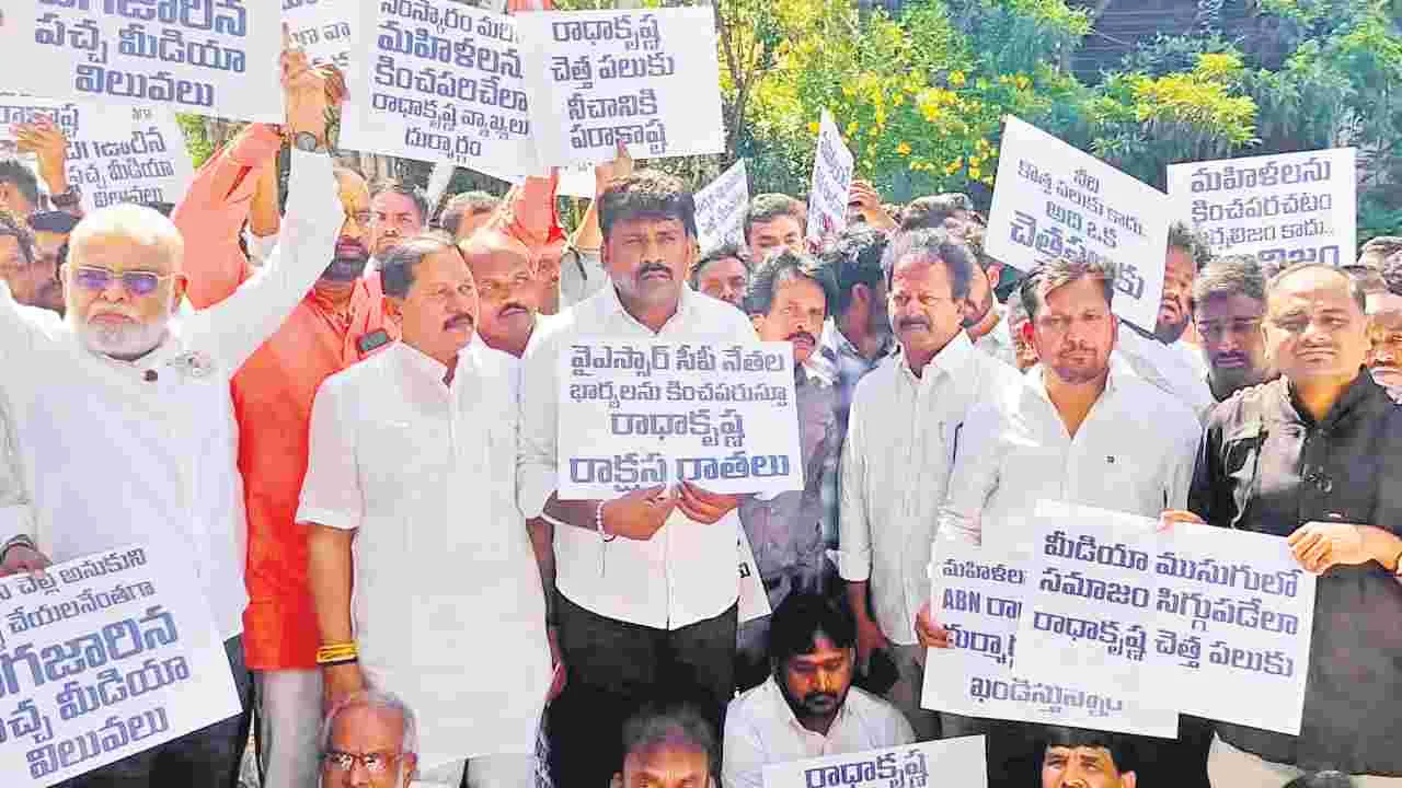 హైదరాబాద్/తిరుపతి, ఏప్రిల్ 7(ఆంధ్రజ్యోతి): ‘వీకెండ్ కామెంట్’లో మహిళలను అవమానించారం టూ వైసీపీ నేతలు రచ్చకు దిగారు. హైదరాబాద్లోని ‘ఏబీఎన్ - ఆంధ్రజ్యోతి’ ప్రధాన కార్యాలయంపై దాడికి ప్రయత్నించారు. శాంతియుత ప్రదర్శన పేరిట నానా యాగీ చేశారు. తిరుపతిలోనూ ‘ఆంధ్రజ్యోతి’ ప్రతులను తగలబెడుతూ, యాజమాన్యానికి వ్యతిరేకంగా అసభ్యకర పదజాలంతో వైసీపీ నేతలు నోరు పారేసుకున్నారు. జగన్ చేసిన ‘మావిగన్’ ప్రతిపాదనతో జనంలో పలుచనైన వైసీపీ నేతలు... దీని నుంచి దృష్టి మరల్చేందుకు వ్యూహం రచించారు. వైసీపీ తీరును విశ్లేషిస్తూ శనివారం ‘ఏబీఎన్-ఆంధ్రజ్యోతి’లో ప్రసారమైన ‘వీకెండ్ కామెంట్’లో మహిళలను అవమానించారంటూ రాద్ధాంతం మొదలుపెట్టారు. ‘ఏబీఎన్-ఆంధ్రజ్యోతి’ సంస్థల ముట్టడికి రెండు రోజులుగా కసరత్తు మొదలు పెట్టారు. పథకం ప్రకారం మంగళవారం ఉదయం వైసీపీ నేతలు హైదరాబాద్ ఫిలిం ఛాంబర్ వద్ద కలుసుకున్నారు. ప్లకార్డులు పట్టుకొని అక్కడికి సమీపంలోని ‘ఏబీఎన్ ఆంధ్రజ్యోతి’ కార్యాలయం వైపు ఒక్క ఉదుటున పరుగులు తీశారు. అక్కడే ఉన్న పోలీసులు అడ్డుకునే యత్నం చేయగా తోసుకుంటూ ముందుకు వెళ్లారు. ‘ఏబీఎన్’ యాజమాన్యాన్ని జుగుప్సాకరంగా దూషిస్తూ, ప్రధాన కార్యాలయం లోపలికి దూసుకెళ్లేందుకు ప్రయత్నించారు. అప్రమత్తమైన పోలీసులు వారిని అడ్డుకున్నారు. దీంతో ఆందోళనకారులు, పోలీసులకు మధ్య తోపులాట చోటుచేసుకుంది. ఎట్టకేలకు వైసీపీ నేతలను పోలీసులు నిలువరించి... హద్దులు దాటొద్దని గట్టిగా హెచ్చరించారు. దీంతో వైసీపీ నేతలు ‘ఏబీఎన్’ కార్యాలయం ఎదుట బైఠాయించి ఆందోళనకు దిగారు. శాంతియుతంగా ఆందోళన చేస్తున్నామంటూనే దూషణలు చేస్తూ భయపట్టే ప్రయత్నం చేశారు. గంటకుపైగా అక్కడే ఉండి ఉద్రిక్తతలు సృష్టించారు. అక్కడి నుంచి కదలకపోతే కేసులు పెట్టాల్సి వస్తుందని పోలీసులు హెచ్చరించడంతో వెనక్కి తగ్గారు. ఈ ఆందోళన చేసిన వారిలో వైసీపీ నేతలు అంబటి రాంబాబు, ఆదిమూలపు సురేశ్, జోగి రమేశ్, కాకాణి గోవర్ధన్ రెడ్డి, మేరుగ నాగార్జున, రామసుబ్బారెడ్డి, నేదురుమల్లి రామకృష్ణారెడ్డి, తోపుదుర్తి ప్రకాశ్ రెడ్డి, ఎస్వీ కృష్ణమోహన్ రెడ్డి, లక్ష్మీ పార్వతి, కారుమూరి వెంకట్ రెడ్డి, మార్గాని భరత్, ఎమ్మెల్యే చంద్రశేఖర్ తదితరులు ఉన్నారు.