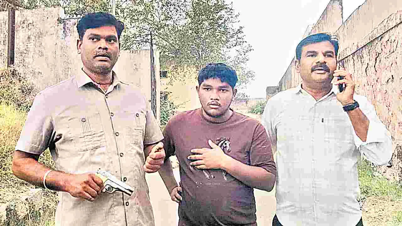 విజయవాడ, మార్చి 7 (ఆంధ్రజ్యోతి): లాడ్జిలో తనిఖీలకు వచ్చిన పోలీసులపై యువకుడు పిస్టల్తో కాల్పులకు యత్నించాడు. ట్రిగ్గర్ లాక్ అవడంతో అది పేలలేదు. శనివారం ఉదయం విజయవాడలో జరిగిందీ ఘటన. పోలీసులు తెలిపిన వివరాల ప్రకారం.. మహబూబాబాద్ జిల్లా నెల్లికుదురు మండలం రామన్నగూడెం గ్రామానికి చెందిన కనకం మురళీ పటేల్ హైదరాబాద్లో సినీ పరిశ్రమలో ఆర్ట్ డైరెక్టర్ వద్ద సహాయకుడిగా పనిచేస్తున్నాడు. రైలులో పరిచయమైన సోను అనే యువకుడి ద్వారా ఆరు నెలల క్రితం బిహార్లో 7ఎంఎం పిస్టల్ను కొన్నాడు. గుంటూరు జిల్లా పెదకాకానిలో జరుగుతున్న గుడారాల పండుగ కోసం ఈనెల 3న ఆర్టీసీ బస్సులో హైదరాబాద్ నుంచి విజయవాడకు వచ్చాడు. బస్టాండ్ వద్ద కృష్ణలంక వైపు జాతీయ రహదారిని ఆనుకుని ఉన్న షిరిడీ బాలాజీ లాడ్జిలో బస చేశాడు. ఆపరేషన్ వజ్రప్రహార్లో భాగంగా ఈగల్ బృందాలు, కృష్ణలంక పోలీసులు, టాస్క్ఫోర్స్ పోలీసులు సంయుక్తంగా శనివారం తెల్లవారుజామున కార్డన్సెర్చ్ చేపట్టారు. కృష్ణలంక స్టేషన్ హెడ్కానిస్టేబుల్ విజయ సారధి నాయక్ బృందం ఉదయం ఆరు గంటలకు లాడ్జిలో మురళీ ఉన్న గదిలోకి ప్రవేశించి తనిఖీలు చేస్తుండగా ఓ బ్యాగు నుంచి పటేల్ పిస్టల్ను తీసి నాయక్కు గురిపెట్టాడు. తుపాకీ పేలకపోవడంతో నాయక్ను తోసేసి పారిపోతుండగా పోలీసులు వెంబడించారు. నిందితుడు లాడ్జి నుంచి రాజీవ్గాంధీ పార్కు వైపు పరుగెడుతూ మరో రెండుసార్లు పోలీసులపై కాల్పులకు యత్నించాడు. ఎట్టకేలకు నెహ్రూ బస్టాండ్ ఎదురుగా రైల్వే ట్రాక్ సమీపంలో టాస్క్ఫోర్స్ కానిస్టేబుల్ రాయితో కొట్టగా నిందితుడు కిందపడ్డాడు. పిస్టల్ ఎందుకు కొన్నావని పోలీసులు ప్రశ్నించగా, స్వగ్రామంలో కొంతమందితో తనకు గొడవలు ఉన్నాయని చెప్పినట్టు తెలిసింది. నిందితుడి నుంచి ఐదు బుల్లెట్లు, పెప్పర్ స్ర్పే, ఎలక్ట్రికల్ షాకింగ్ గన్ కూడా స్వాధీనం చేసుకున్నారు.