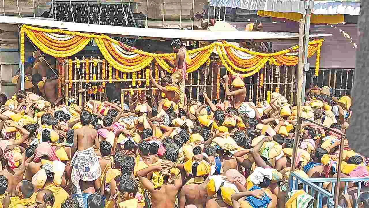 శ్రీశైలం, ఫిబ్రవరి 9 (ఆంధ్రజ్యోతి): ఊహించని విధంగా శ్రీశైలంలో శివస్వాముల రద్దీ పెరిగింది. మండల దీక్ష పూర్తిచేసుకుని పాదయాత్రగా శ్రీశైలం చేరుకుంటున్న జ్యోతిర్ముడి శివస్వాములకు మల్లన్న స్పర్శ దర్శనం ఉచితంగా కల్పించాలని దేవస్ధానం నిర్ణయించింది. అయితే రద్దీ కారణంగా స్వామివారి దర్శనం ఆలస్యం కావడంతో శివదీక్షాపరులు సహనం కోల్పోయి ఆందోళనకు దిగారు. జ్యోతిర్ముడి స్వాములకు సోమవారం తెల్లవారుజాము నుంచి రెండు గంటలకోసారి స్పర్శ దర్శనం కల్పించారు. శివస్వాములకు నాలుగు రోజులు మాత్రమే స్పర్శదర్శనం అవకాశం కల్పించడంతో శ్రీశైలానికి పోటెత్తారు. అయితే కొంతమంది రెండోసారి కూడా స్పర్శ దర్శనం కోసం కంపార్టుమెంట్లు, క్యూలైన్లలో చొరబడటంతో సమస్య తలెత్తింది. ఈ క్రమంలో ఉదయం 11గంటల సమయం నుంచి చంద్రావతి కల్యాణ మండపంలో ఏర్పాటు చేసిన బారికేడ్లు, కంచెలను శివభక్తులు పూర్తిగా ధ్వంసం చేసి గుంపులుగా ఆలయంలోకి ప్రవేశించి ధ్వజస్తంభానికి ఇరువైపులా క్యూలైన్లలో నిండిపోయారు. దీంతో రద్దీ విపరీతంగా పెరిగిపోగా, సహనం కోల్పోయిన కొందరు శివదీక్షాపరులు నినాదాలు చేస్తూ, గేట్లకు వేసిన తాళాలు పగులకొడుతూ అడ్డుకునేందుకు వచ్చిన ఆలయ అధికారులు, సిబ్బందితోపాటు సేవ చేస్తున్న శివసేవకులపై ఆగ్రహం వ్యక్తం చేశారు. దీంతో అప్రమత్తమైన జిల్లా కలెక్టర్ రాజకుమారి పోలీసు భద్రతను పెంచారు. ఆలయ పరిసరాల్లోని క్యూలైన్లను పూర్తిగా ధ్వంసం చేసి, అధికారులపై తిరగబడుతున్న వారిని అదుపు చేసేందుకు నంద్యాల ఏఎస్పీ యుగంధర్బాబు సైతం రంగంలోకి దిగారు. కాగా.. రాత్రి 10 గంటలైనా శివదీక్షాధారులు ఆందోళన విరమించలేదు. ఆలయ ఈఓ ఎం.శ్రీనివాసరావు, పాలకమండలి చైర్మన్ పోతుగుంట రమేష్నాయుడు భక్తులకు సర్ది చెబుతున్నా పరిస్థితి అదుపులోకి రావడం లేదు.