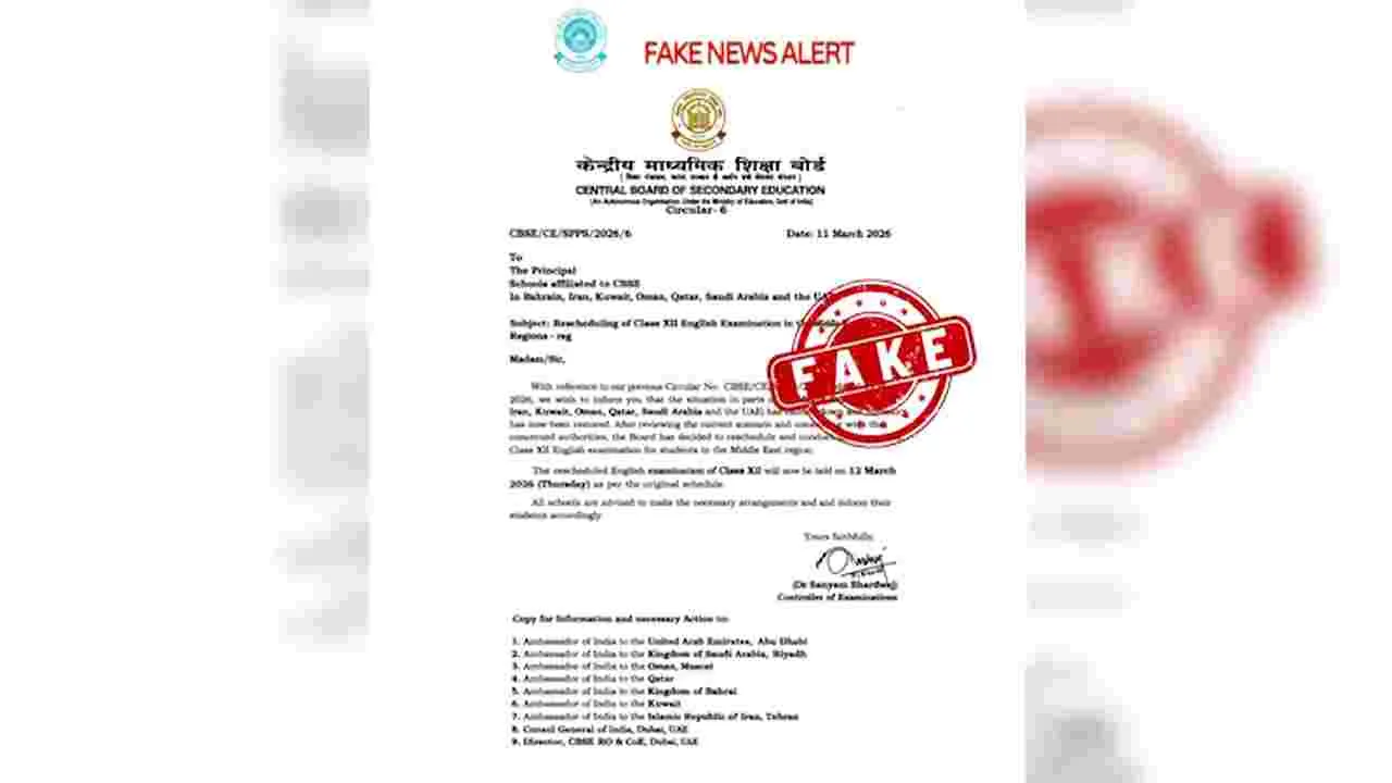 బహ్రెయిన్, ఇరాన్, కువైట్, ఒమన్, ఖతార్, సౌదీ అరేబియా, యునైటెడ్ అరబ్ ఎమిరేట్స్లలో 12వ తరగతి ఇంగ్లీష్ ఎగ్జామ్ సహా ఇతర పరీక్షల తేదీలను మార్చినట్లు కొందరు విద్యార్థులకు ఓ ఫేక్ మెసేజ్ వచ్చింది. ఈ మెసేజ్.. వాట్సాప్, ఇన్స్టా, ఎక్స్ వంటి ప్లాట్ఫామ్లలో విస్తృతంగా షేర్ అవుతూ.. తెగ వైరల్ అయింది. ఈ విషయం సీబీఎస్ఈ అధికారుల దృష్టికి వెళ్లింది. స్పందించిన బోర్డు.. ఆ సందేశంతో బోర్డుకు ఎలాంటి సంబంధం లేదంది. బోర్డు ధ్రువీకరించిన కొన్ని సోషల్ మీడియా ఖాతాలు కూడా ఈ మెసేజ్ను ఫేక్ అని పేర్కొన్నాయి.