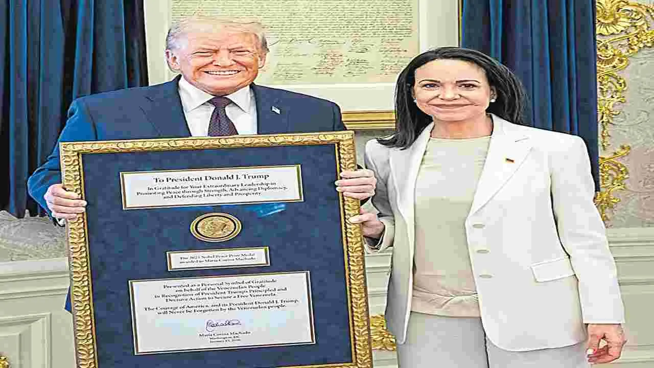 వెనెజువెలా ప్రతిపక్ష నాయకురాలు మచాడో.. తన నోబెల్ శాంతి బహుమతిని అమెరికా అధ్యక్షుడు ట్రంప్నకు బహుకరించారు.