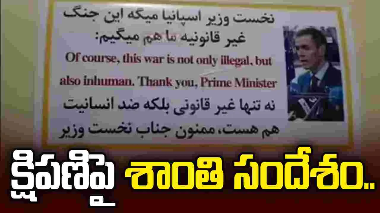ఇరాన్పై దాడి సమర్థనీయం కాదని, ఇది అమానవీయ చర్య అని, వెంటనే యుద్ధాన్ని ముగించాలని ఇటీవల స్పెయిన్ ప్రధాని సాంచెజ్ వ్యాఖ్యానించారు. ఆయన మాటలను ప్రస్తావిస్తూ.. 'నిస్సందేహంగా, ఈ యుద్ధం చట్ట విరుద్ధం మాత్రమే కాదు.. అమానుషం కూడా. ధన్యవాదాలు ప్రధానమంత్రి గారూ' అని రాసి ఉన్న స్టిక్కర్ను క్షిపణిపై అంటించి ఇజ్రాయెల్ పైకి ప్రయోగించారు. ఆ వీడియో ప్రస్తుతం సోషల్ మీడియాలో బాగా వైరల్ అవుతోంది (Iran Israel conflict).