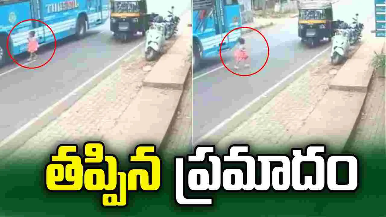 చిన్నారికి తప్పిన బస్సు ప్రమాదం.. వీడియో వైరల్