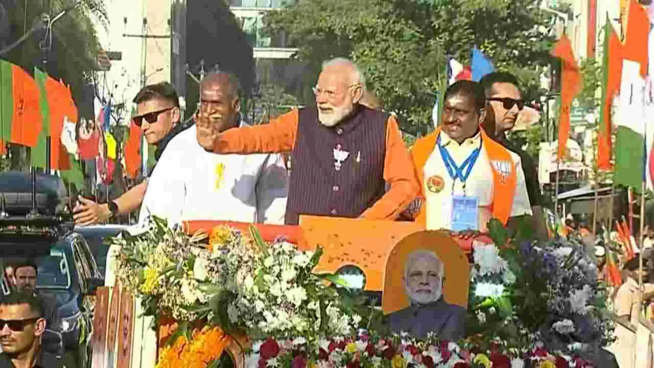 పుదుచ్చేరి: జాతీయ ప్రజాస్వామ్య కూటమి (NDA)కి మద్దతు కోరుతూ ప్రధానమంత్రి నరేంద్ర మోదీ (Narendra Modi) పుదుచ్చేరి (Puducherry)లో శుక్రవారంనాడు భారీ రోడ్షో నిర్వహించారు. ముఖ్యమంత్రి ఎన్.రంగస్వామి, పాండిచ్చేరి హోం మంత్రి ఎ.నమశ్సివాయం సైతం ఈ రోడ్షోలో పాల్గొన్నారు.